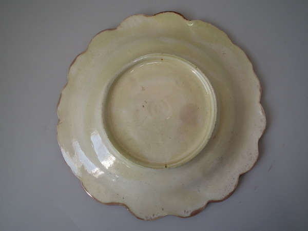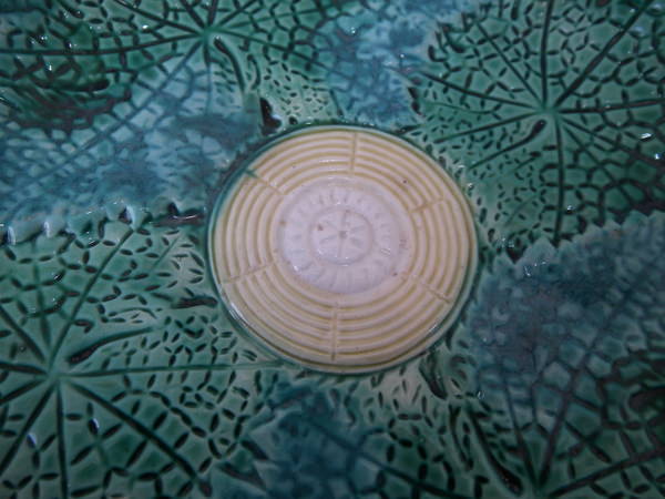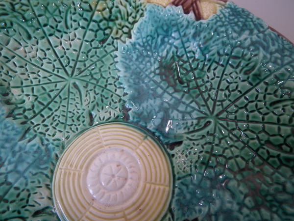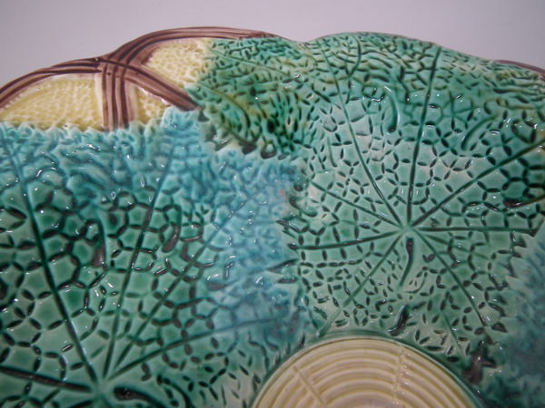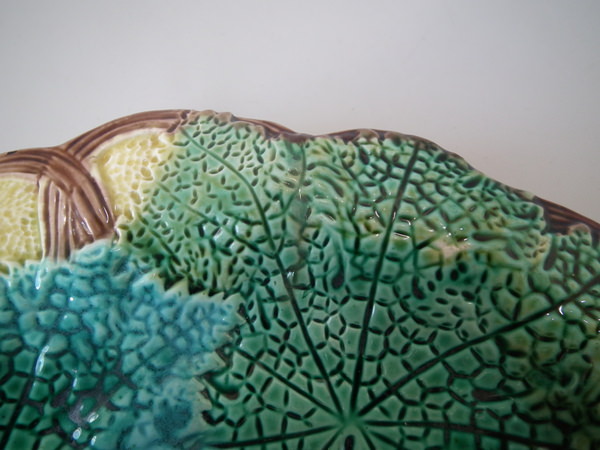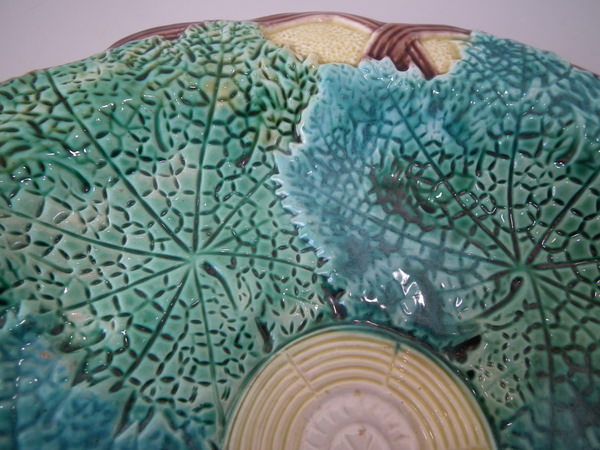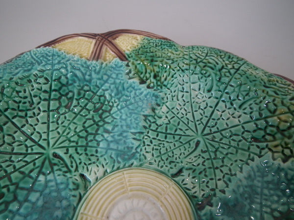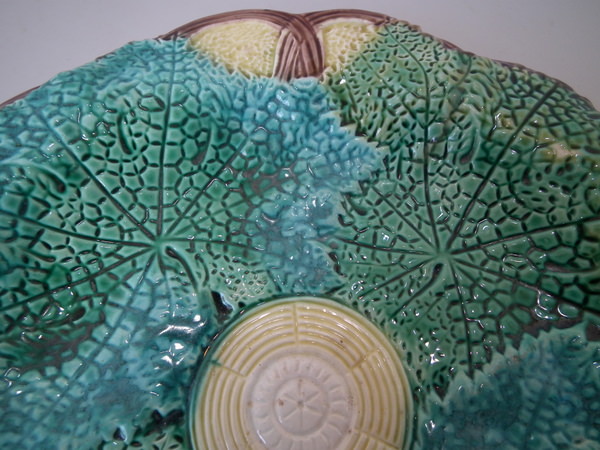 Victorian, circa 1870. 9.1ins high, 9.1ins wide, 1.2ins depth. Majolica plate which features four overlapping leaves with scalloped rim.