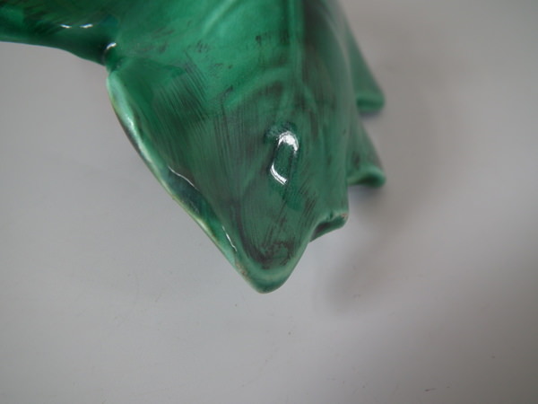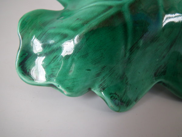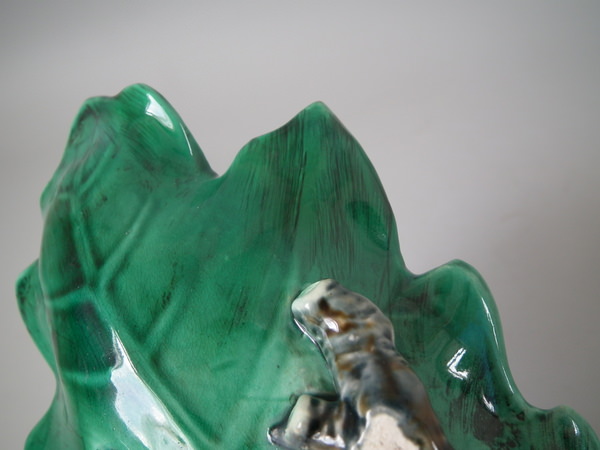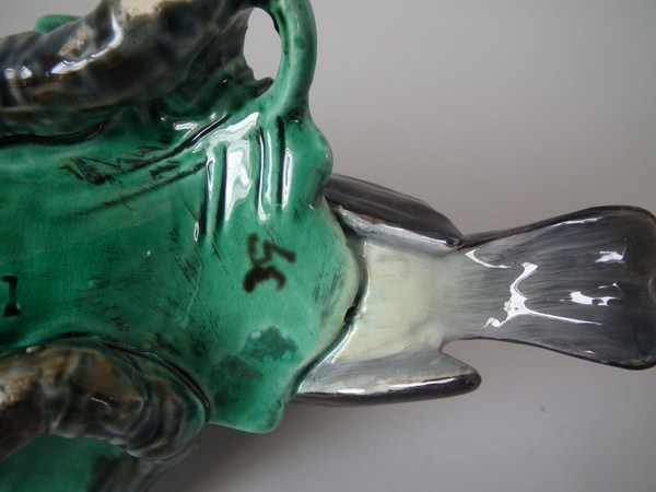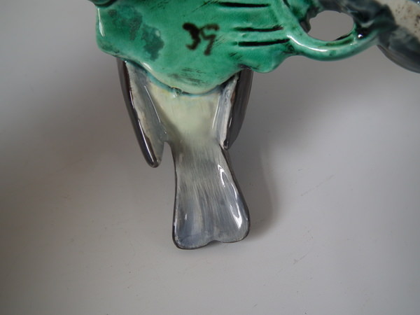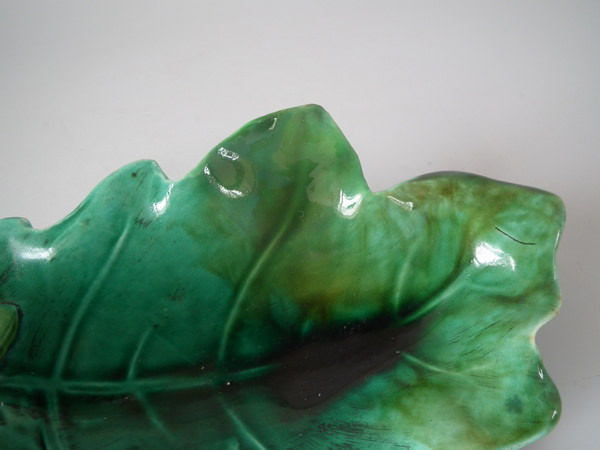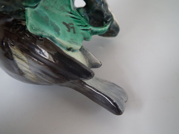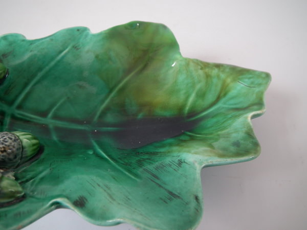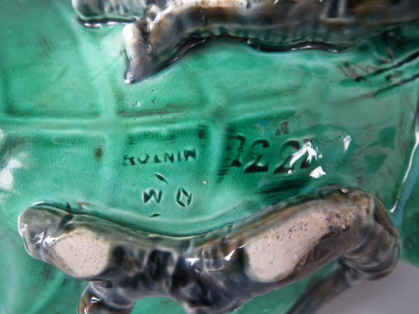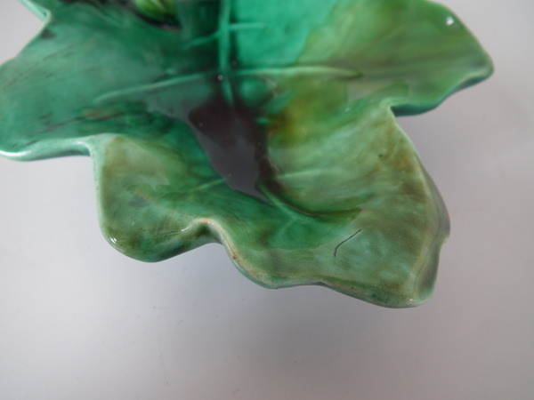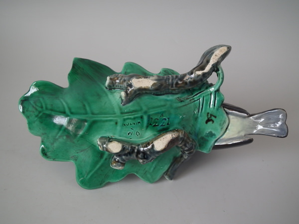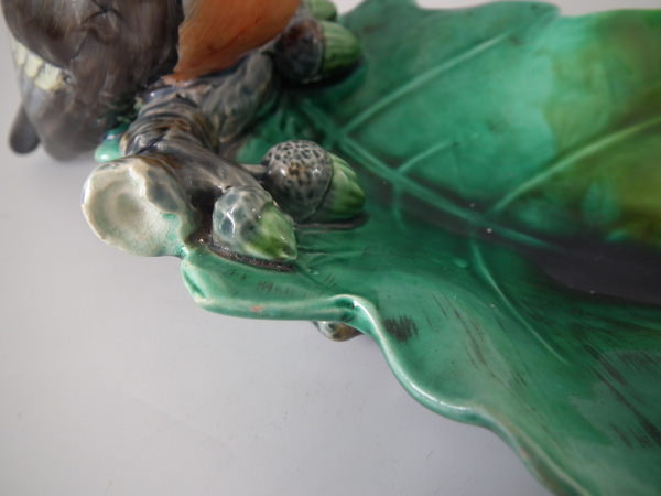 Victorian, circa 1870. 3.5ins high, 7.9ins wide, 4.2ins depth. Minton Majolica nut dish which features a bullfinch