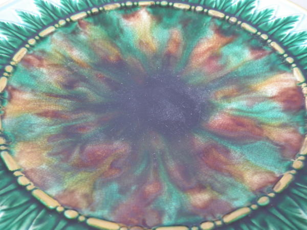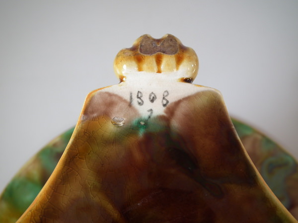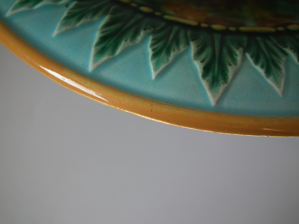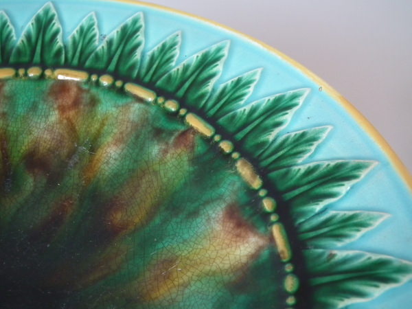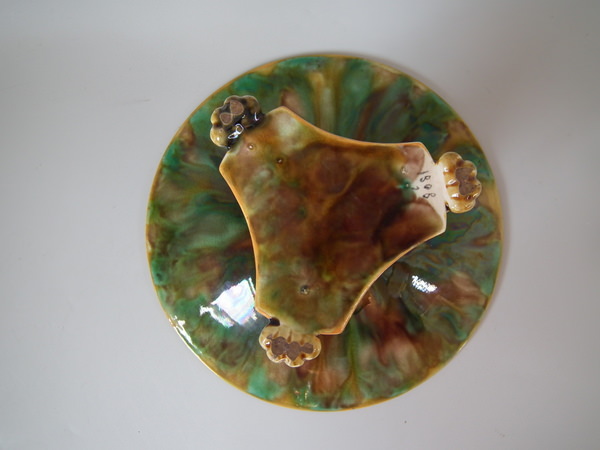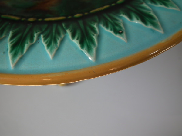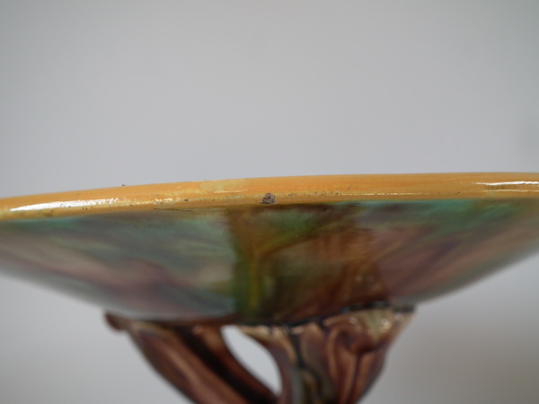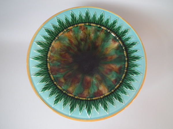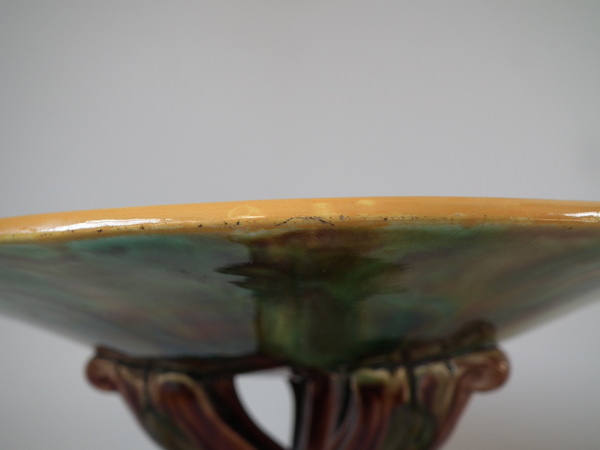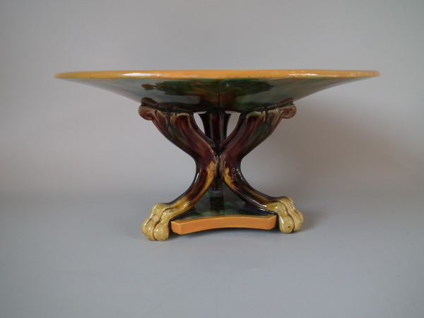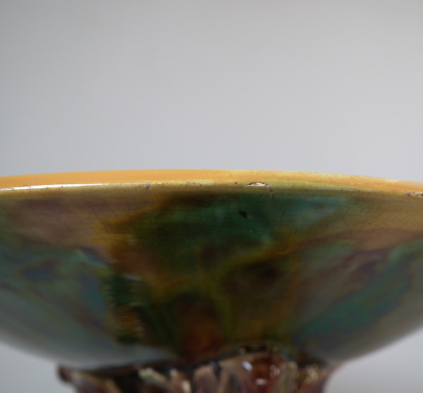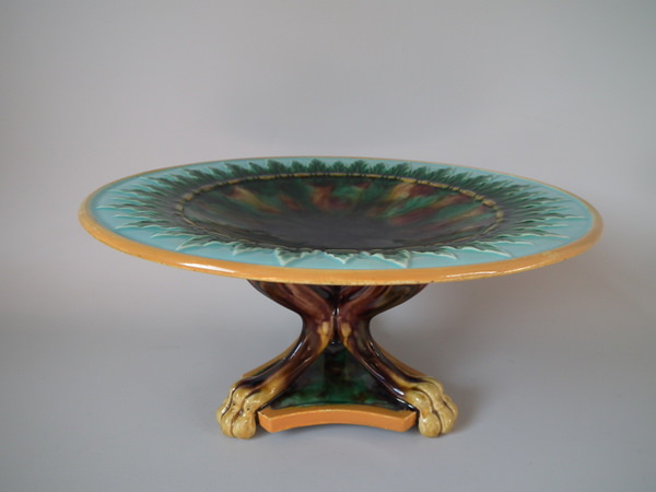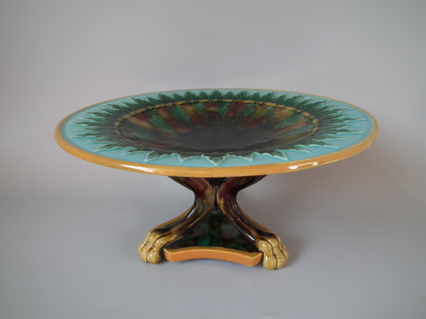 Victorian, circa 1870. 5.3ins high, 9.6ins wide, 9.6ins depth. George Jones Majolica compote which features spikey leaves to the interior and lion paw feet.