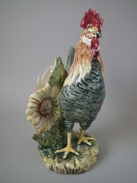 Victorian, circa 1900. 11.2ins high, 8.3ins wide, 5.7ins depth. Unidentified French Majolica spill vase which features a cockerel/rooster stood in front of the vase modelled in the form of a sunflower and leaves.