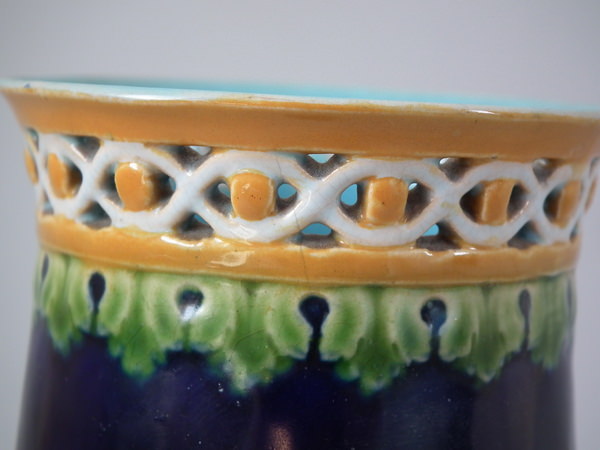 Victorian, circa 1869. 9.2ins high, 3.1ins wide, 3.1ins depth. Minton Majolica goblet which features a putti supporting the cup.