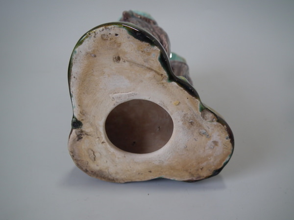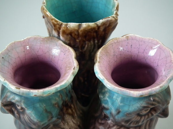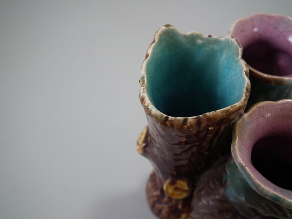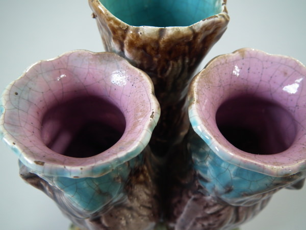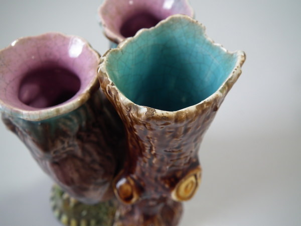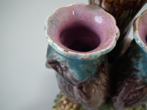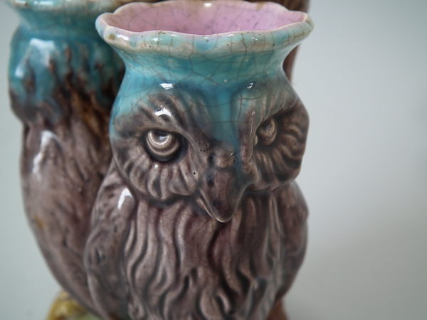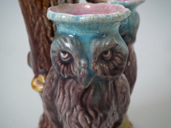 Victorian, circa 1870. 5.1ins high, 3.7ins wide, 2.8ins depth. Majolica posy holder which features two owls stood in front of a tree trunk.