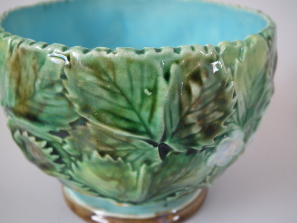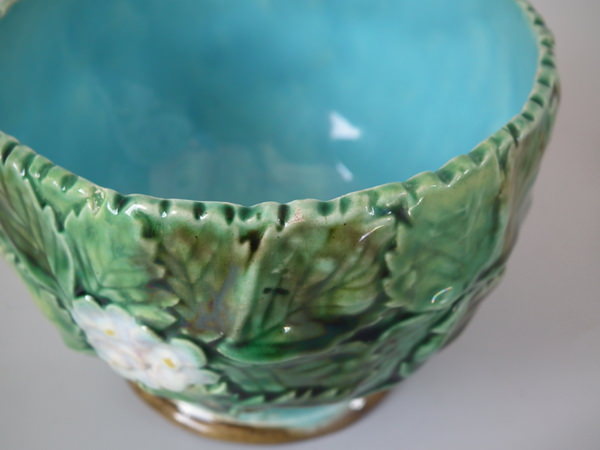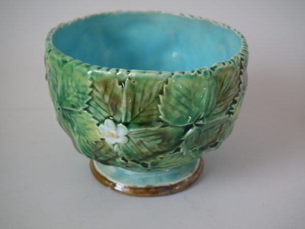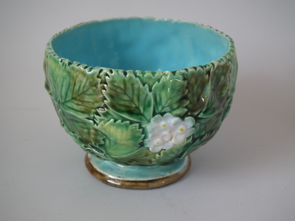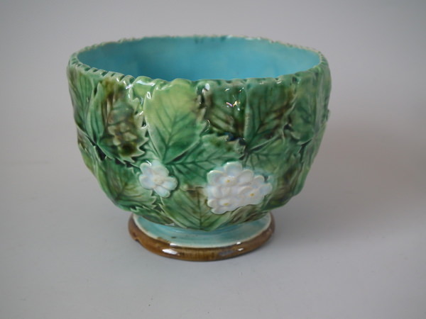 Victorian, circa 1870. 2.8ins high, 3.5ins wide, 3.5ins depth. George Jones Majolica sugar bowl which features strawberry leaves and flowers.