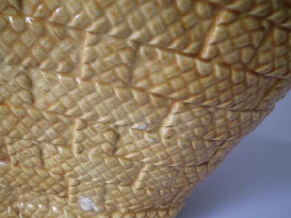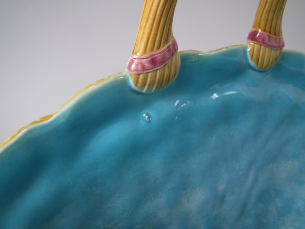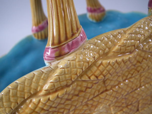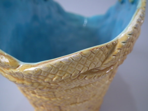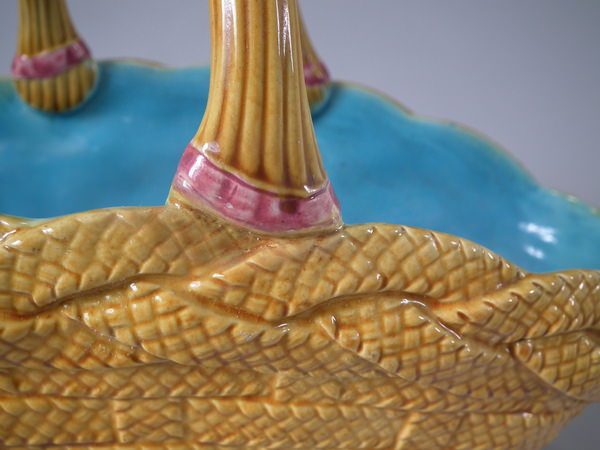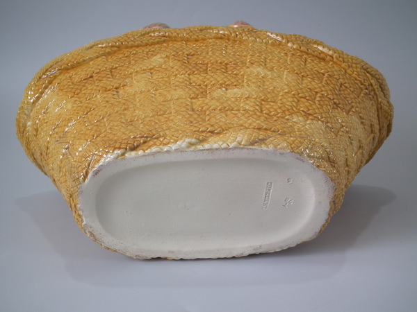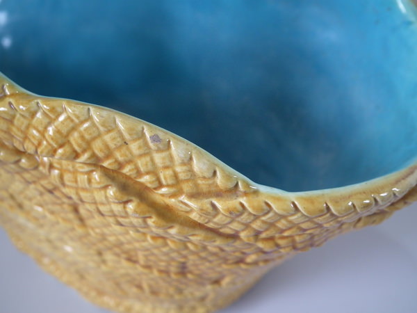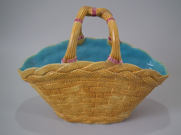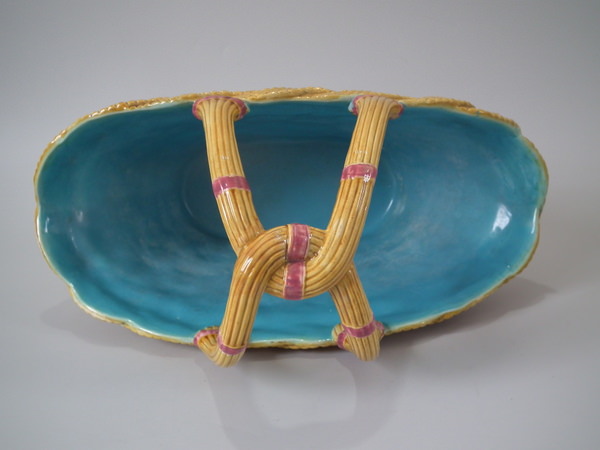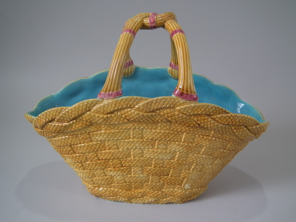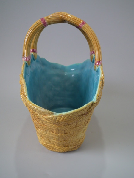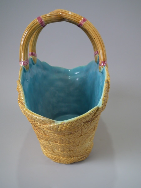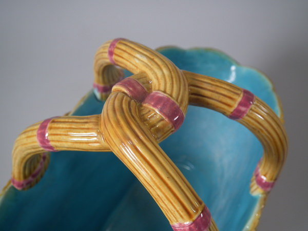 Victorian, circa 1870. 9.1ins high, 12.4ins wide, 5.5ins depth. Copeland Majolica flower basket which features a woven basket with entwined handles.