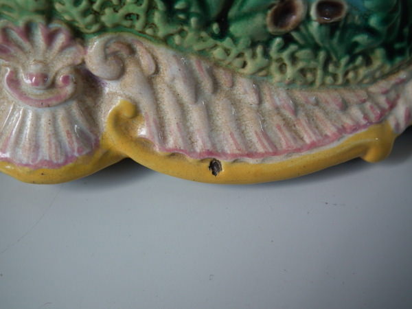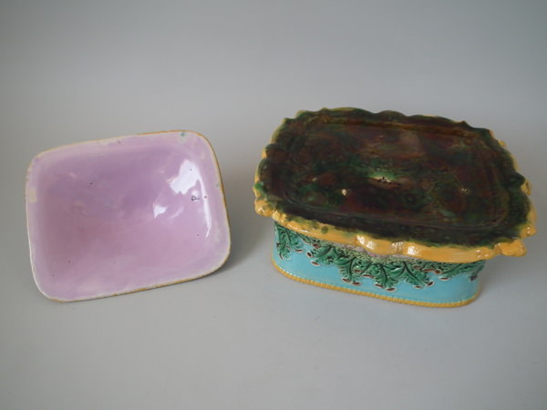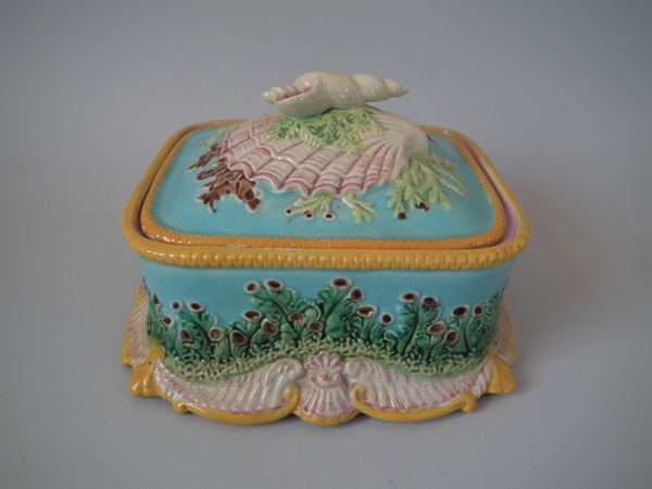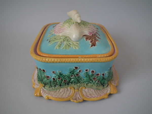 Victorian, circa 1870. 4.3ins high, 6.9ins wide, 6.1ins depth. George Jones Majolica sardine box which features shells, corals and seaweed.