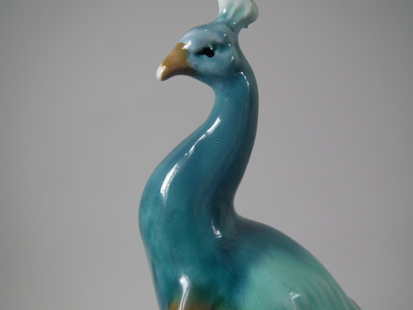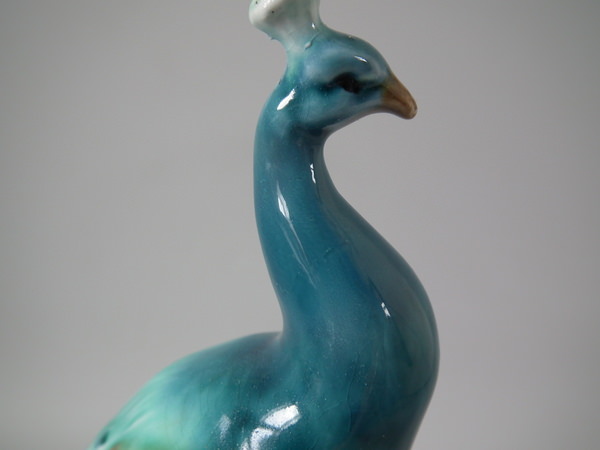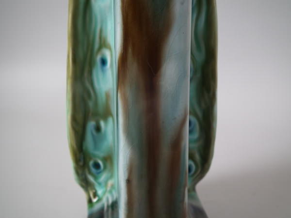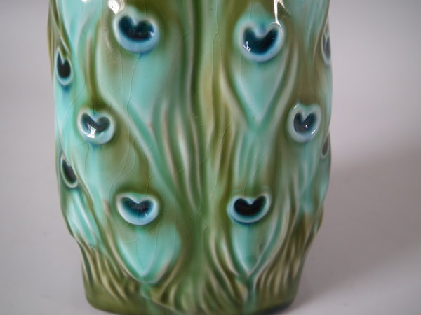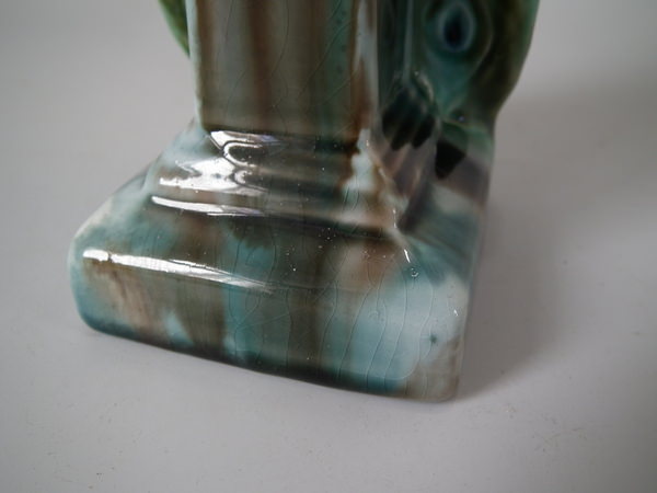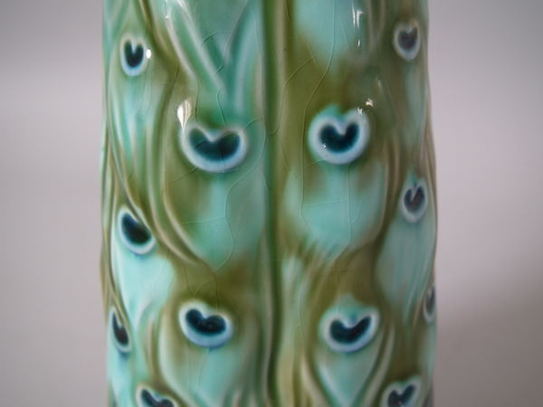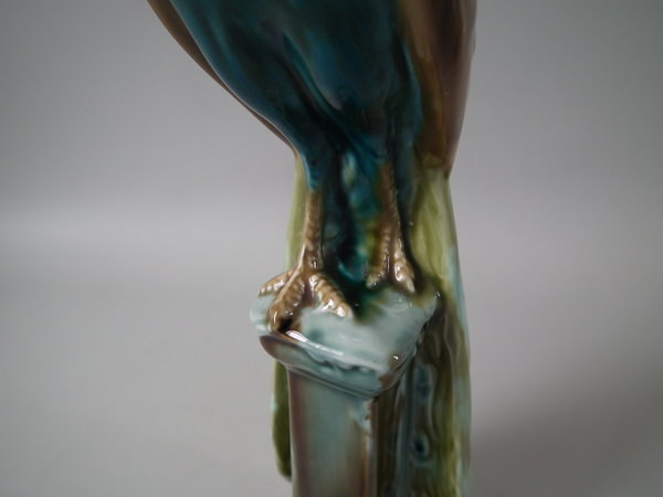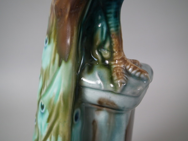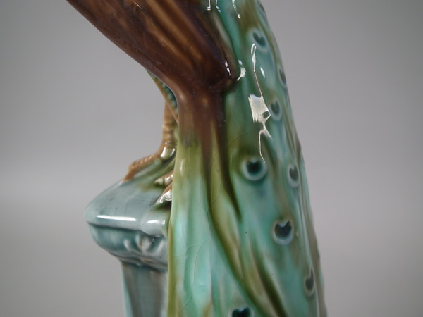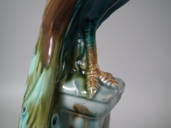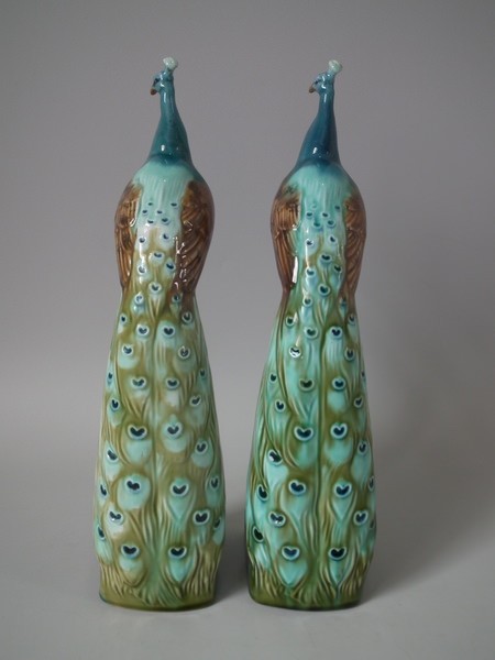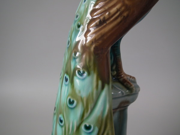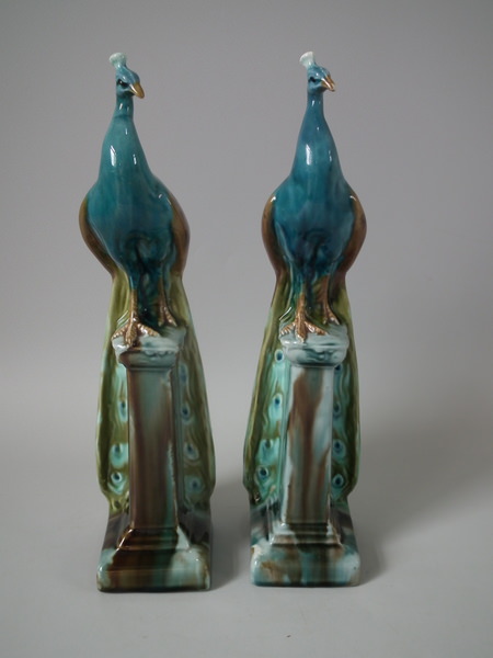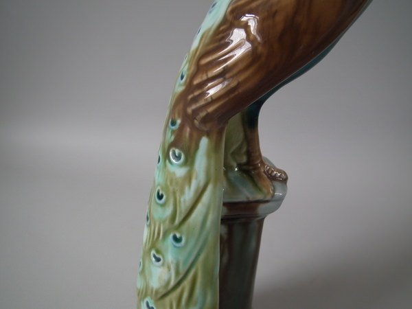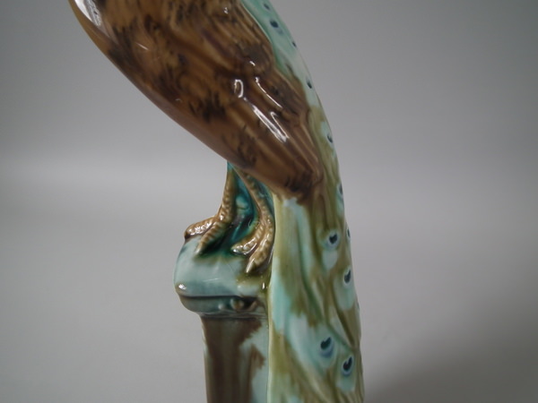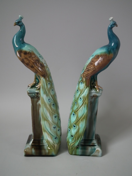 Victorian, circa 1900. Tallest is 11.6ins high, 2.6ins wide, 3.1ins depth. Pair of Mintons Majolica figurals which feature a peacock standing on a pillar.