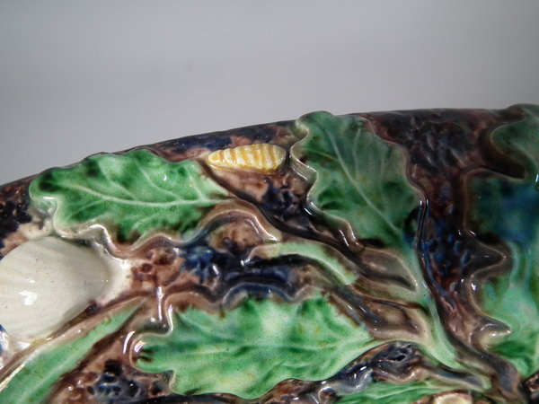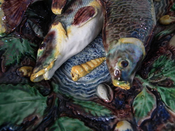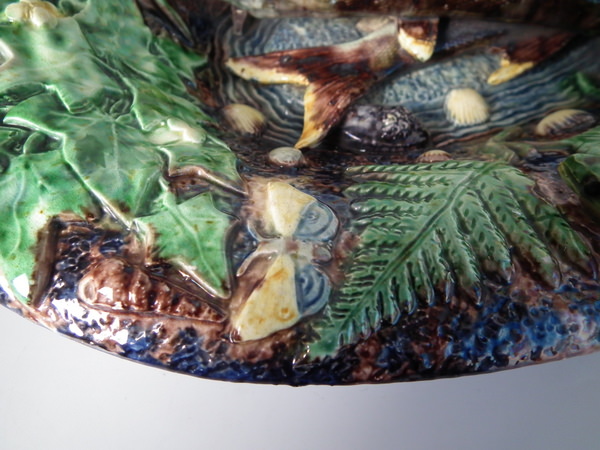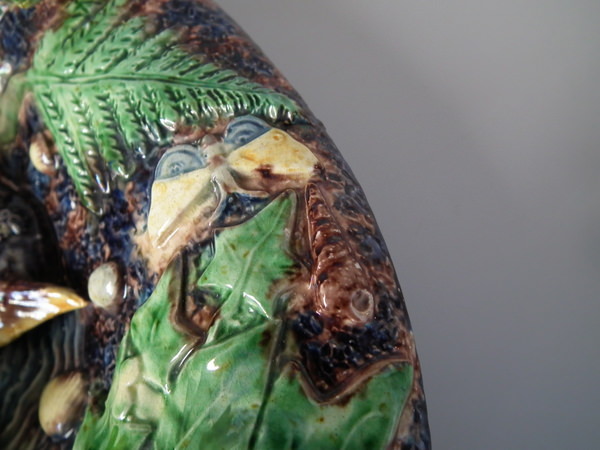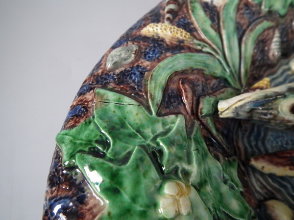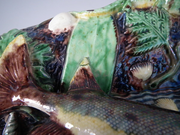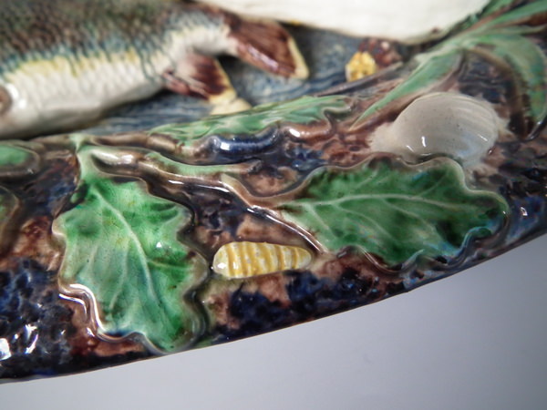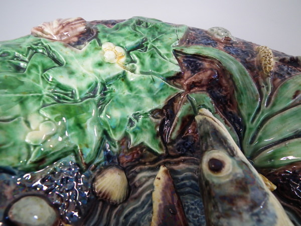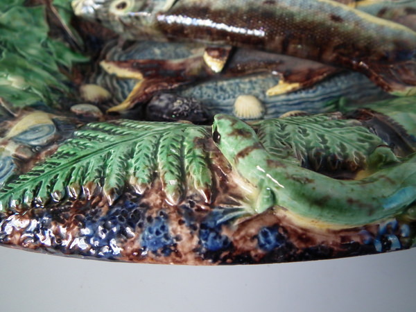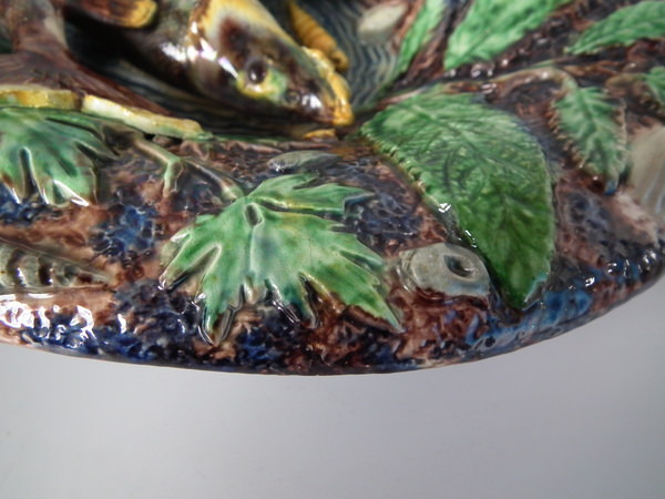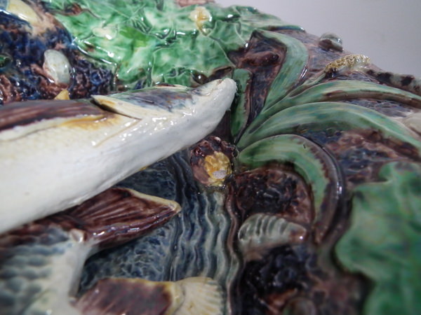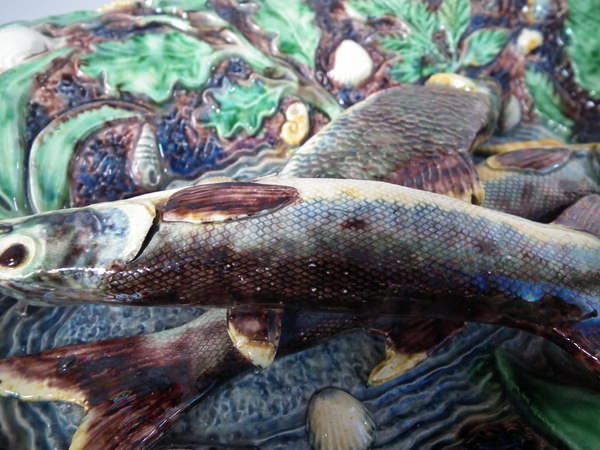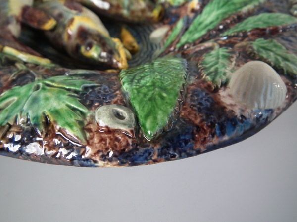 Victorian, circa 1875. 9.4ins high, 14ins wide, 2ins depth. Thomas Sergent French Palissy Majolica wall platter which features three central fish,