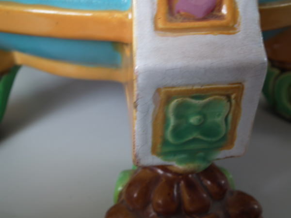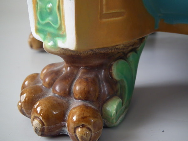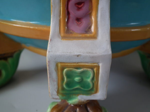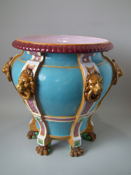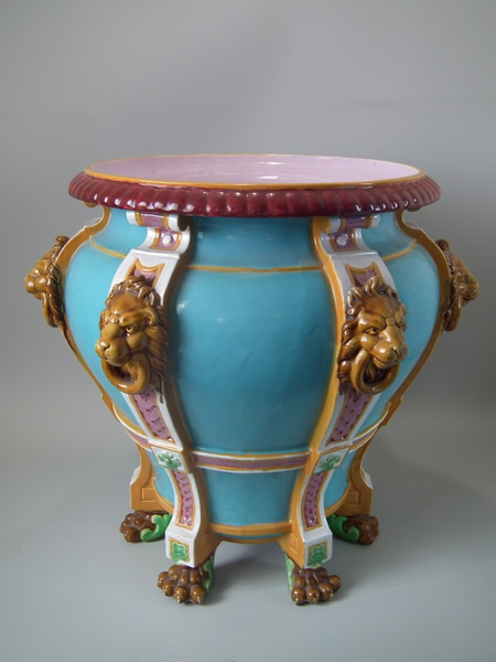 Victorian, circa 1870. 17.3ins high, 19.7ins wide, 19.7ins depth. Minton Majolica jardinière which features lion mask handles and lion paw feet.