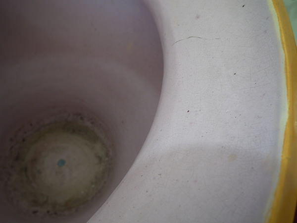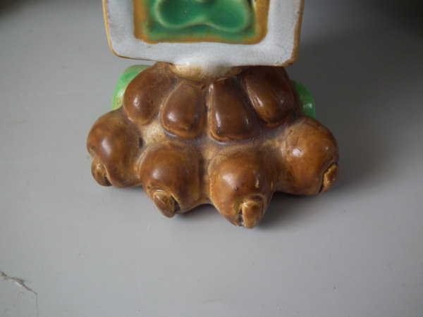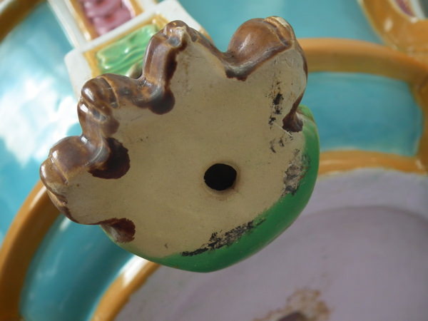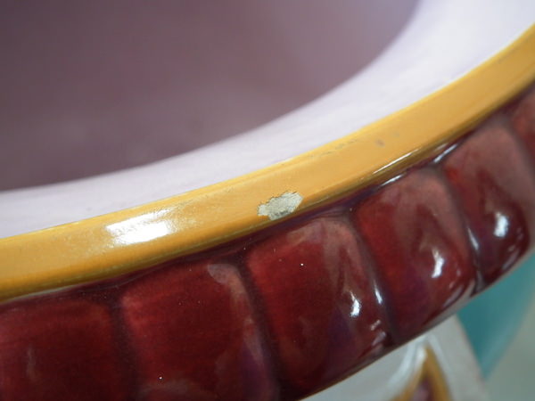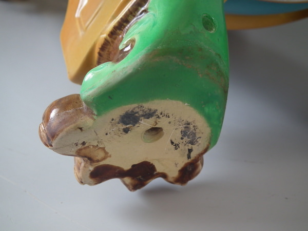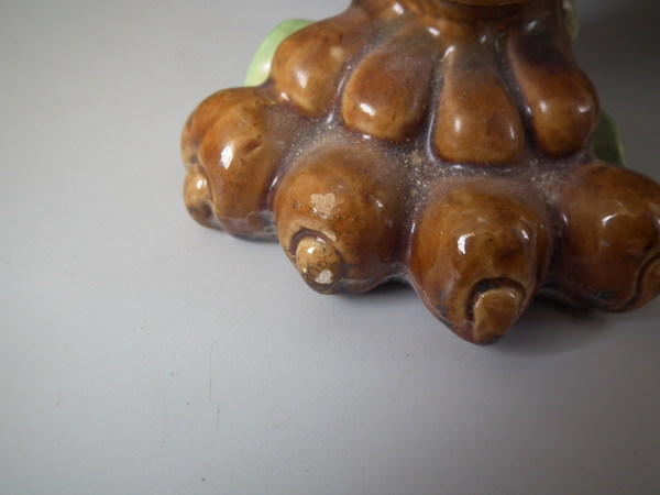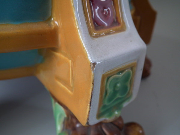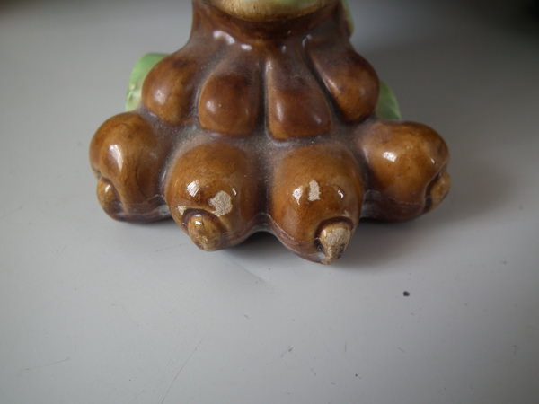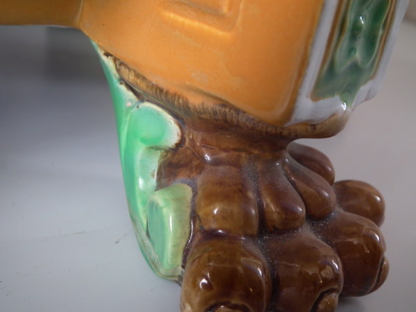 Small flakes to rim, two noses, feet, ochre trim, and white supports above feet.