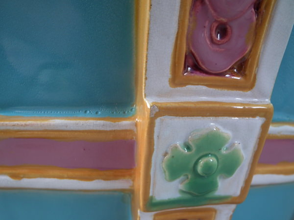 Turquoise ground version. Colouration: white, pink, ochre, are predominant.