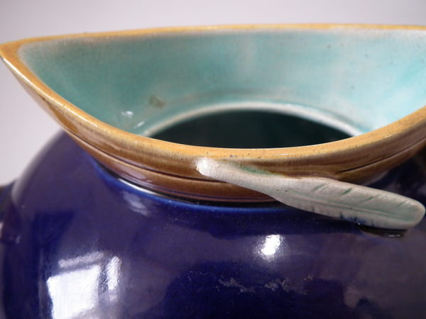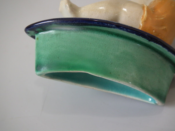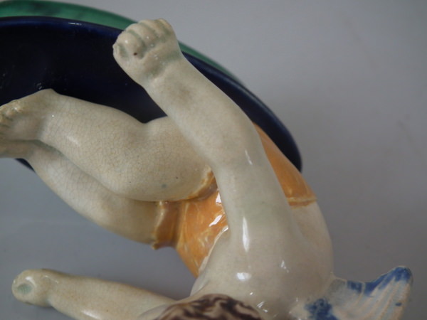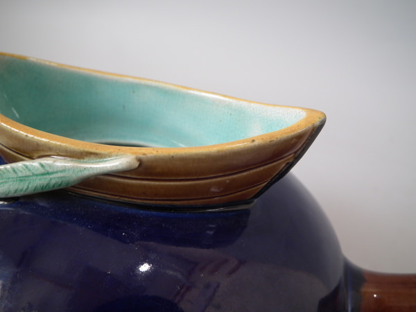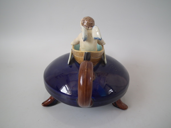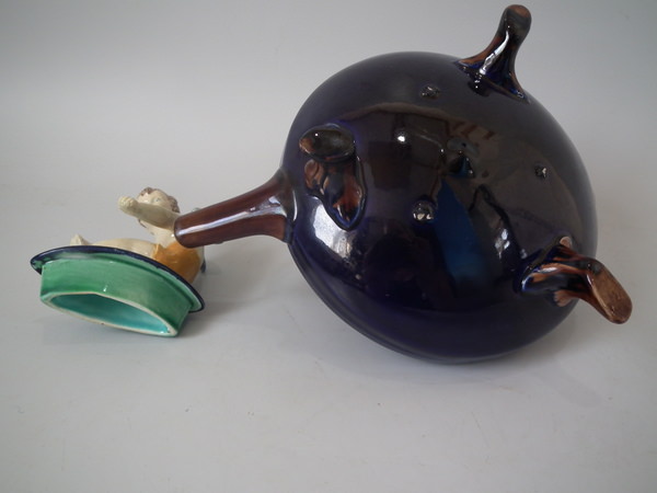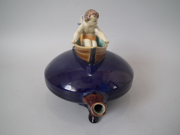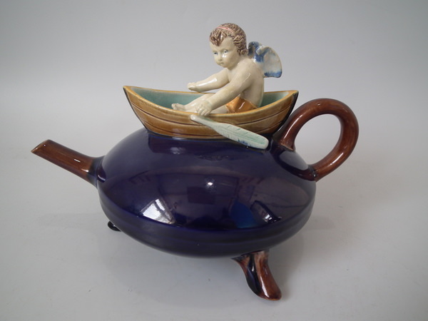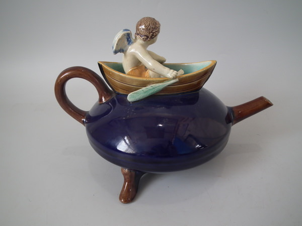 Victorian, circa 1880. 5.7ins high, 8.3ins wide, 5.5ins depth. Holdcroft Majolica teapot which features a winged cherub to the lid, which sits in a rowing boat which forms the opening to the top of the teapot.