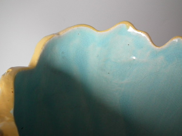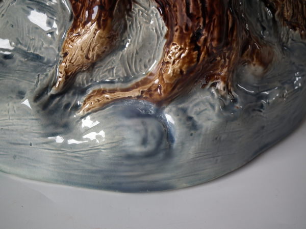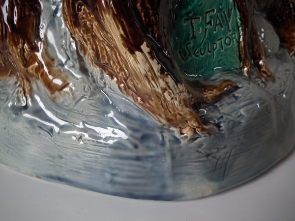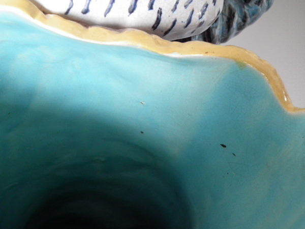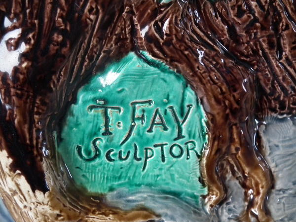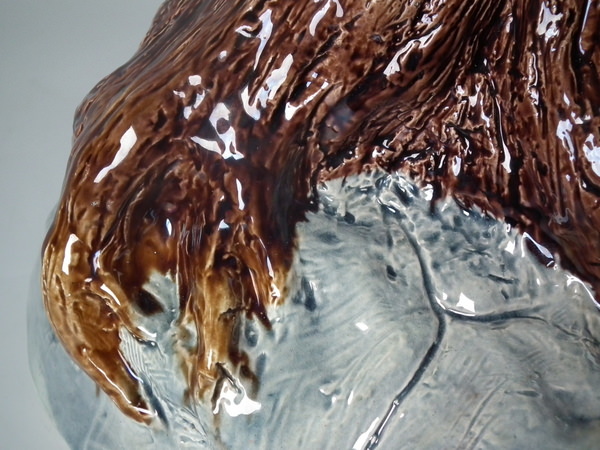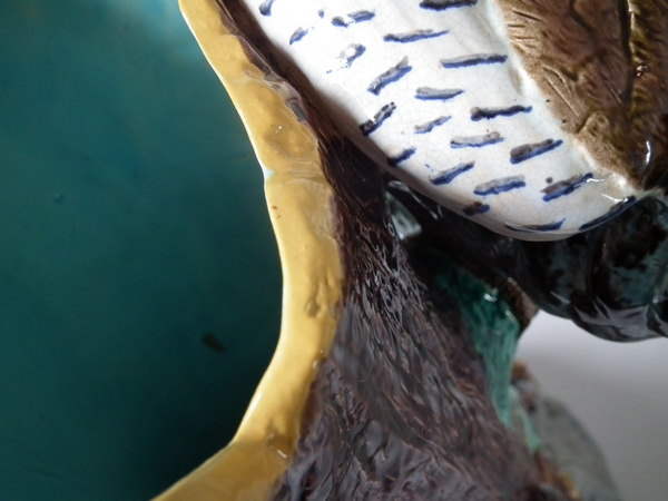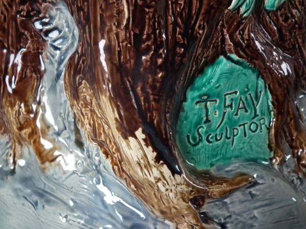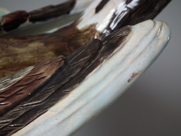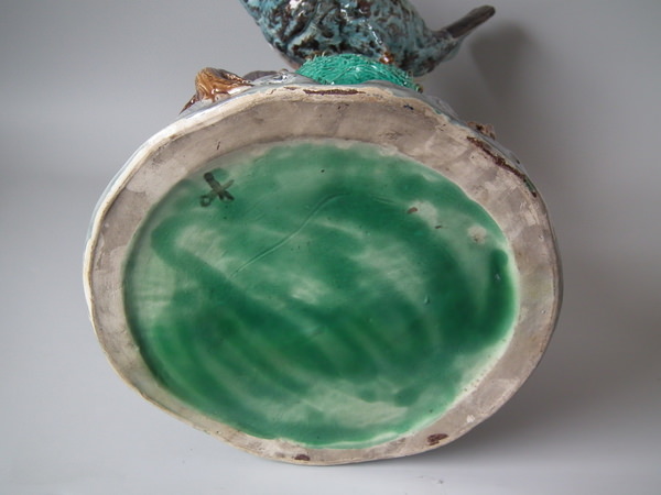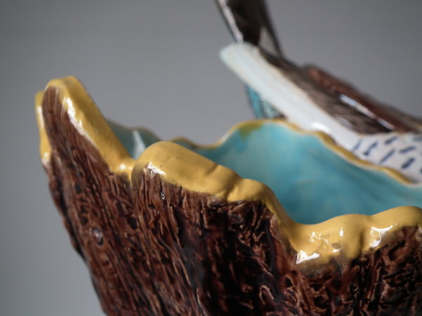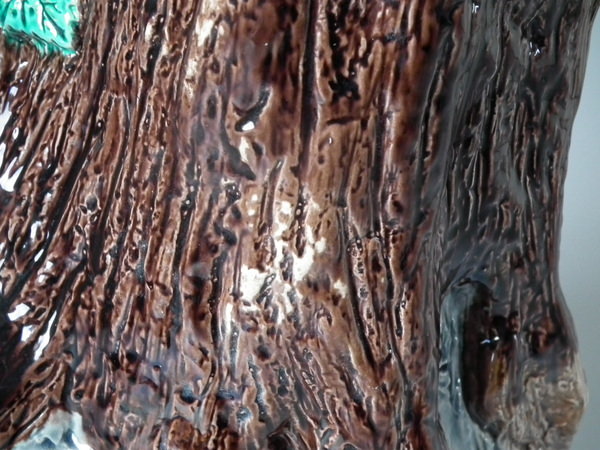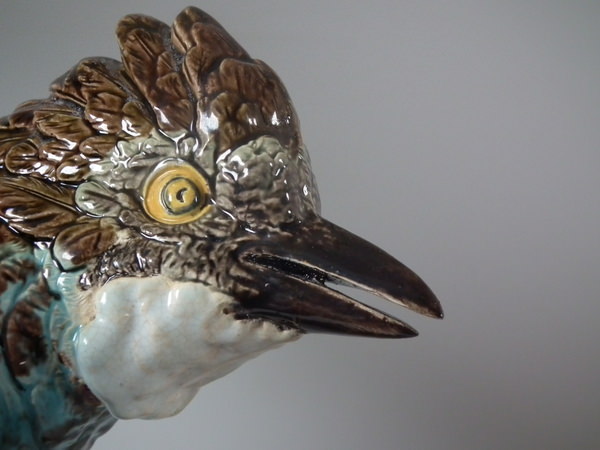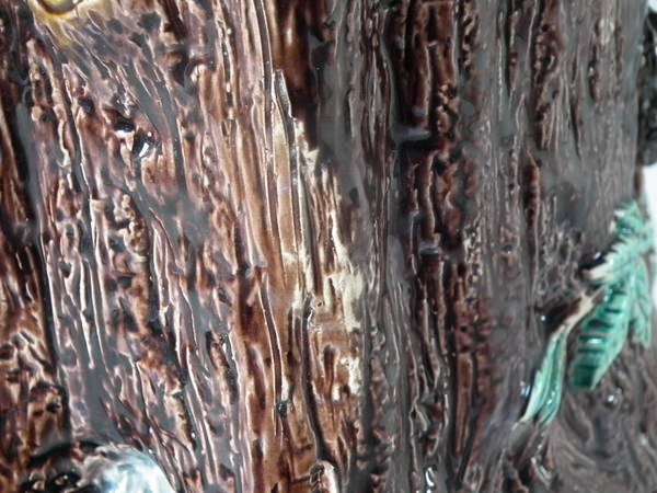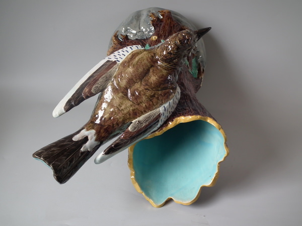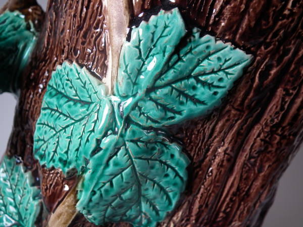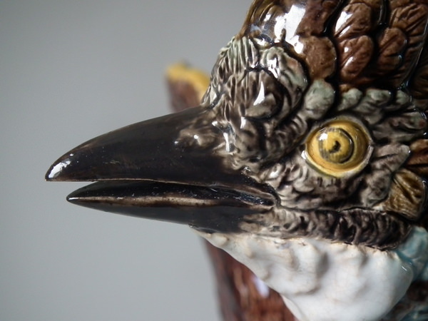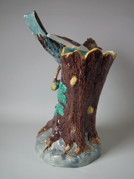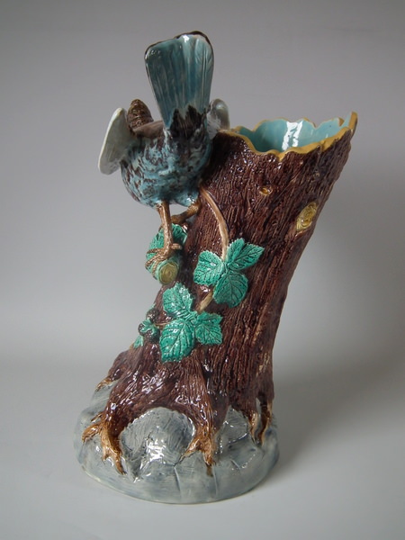 Victorian, circa 1870. 20.4ins high, 12.2ins wide, 11.8ins depth. Holdcroft Majolica vase which features a Jay bird