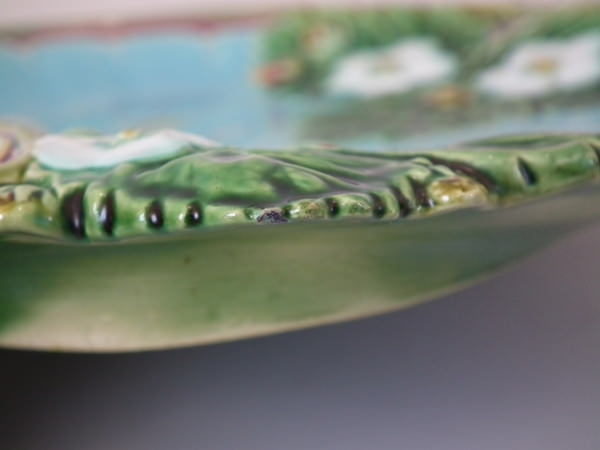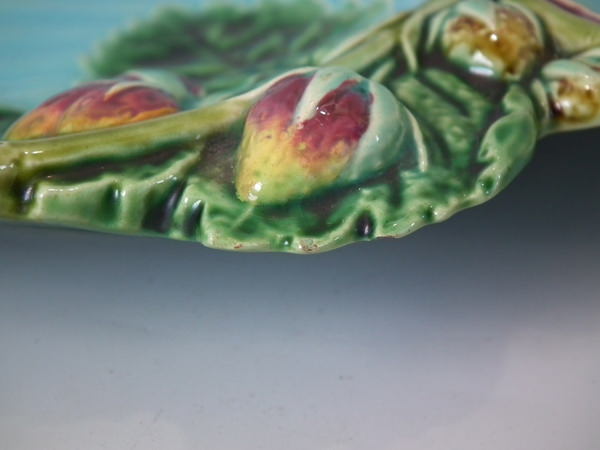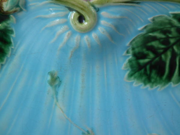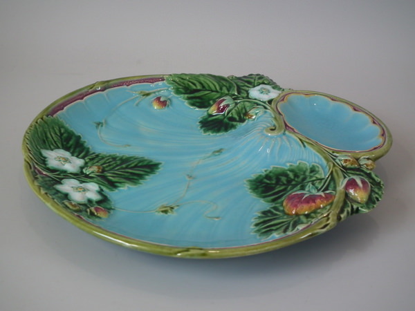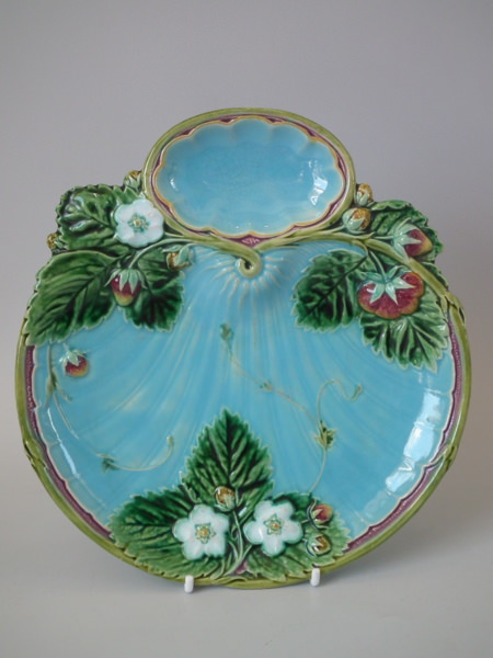 Minton Majolica strawberry server which features strawberries, blossoms and leaves.