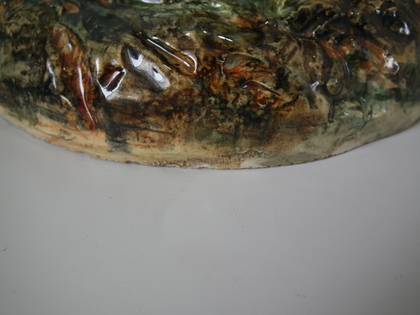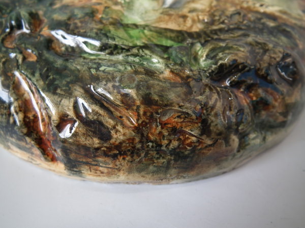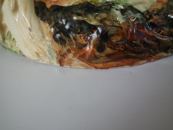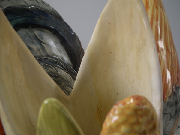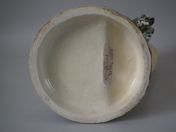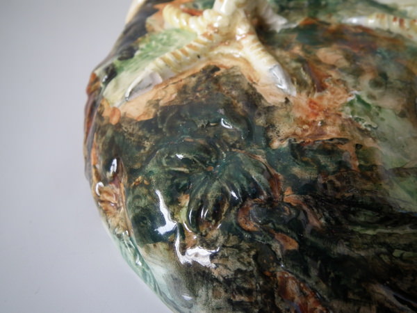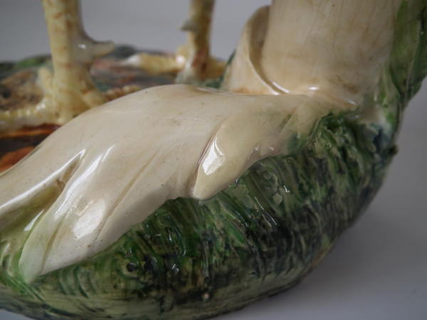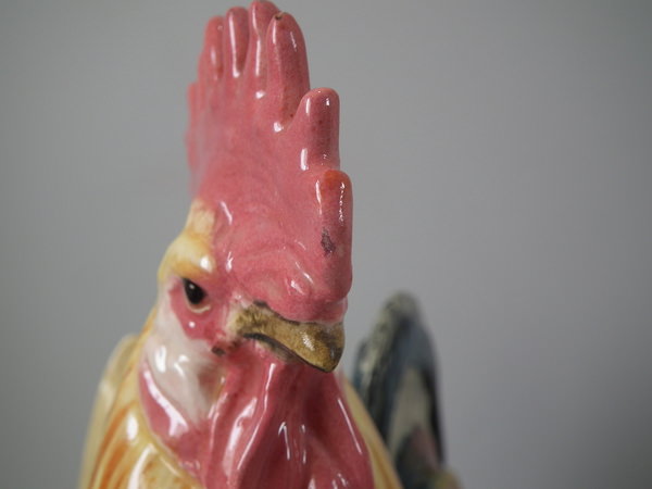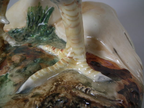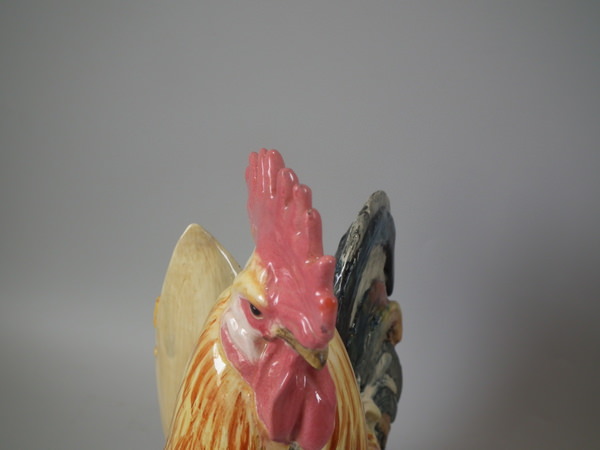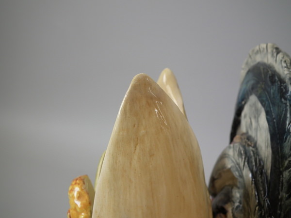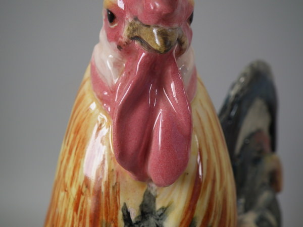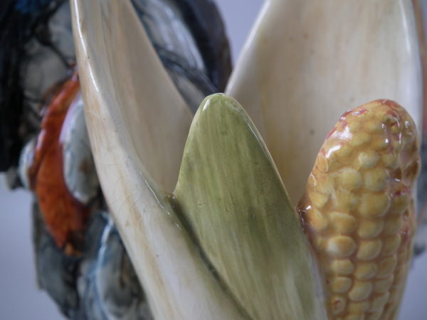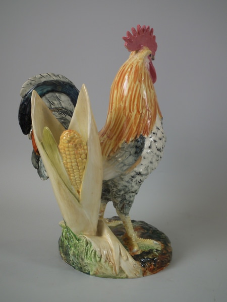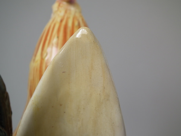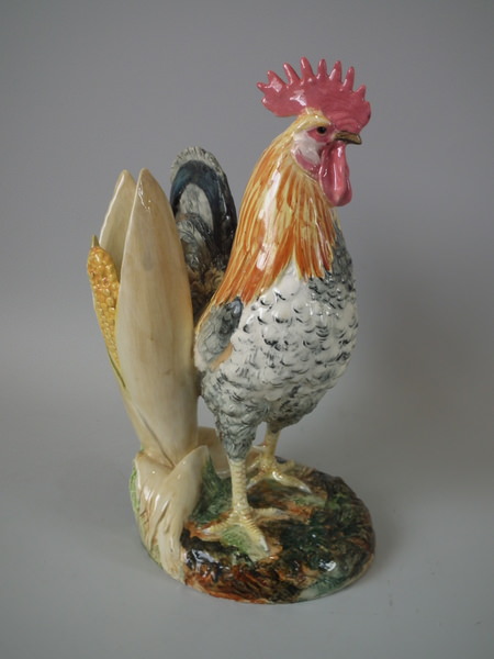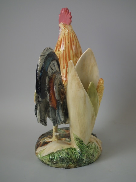 Victorian, circa 1900. 12.8ins high, 7.9ins wide, 5.9ins depth. Delphin Massier Majolica spill vase which features a cockerel/rooster stood in front of the vase modelled in the form of a corn cob.