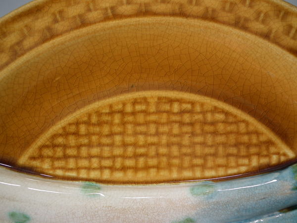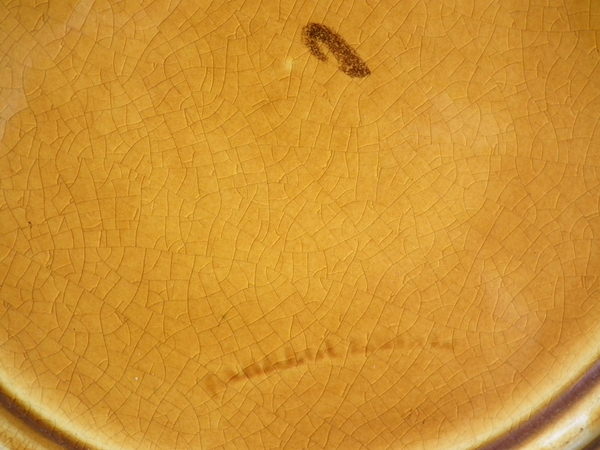 Colouration: ochre, green, white, are predominant. The piece bears maker's marks for the Sarreguemines pottery.