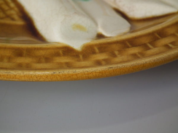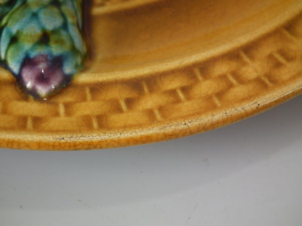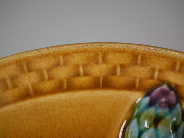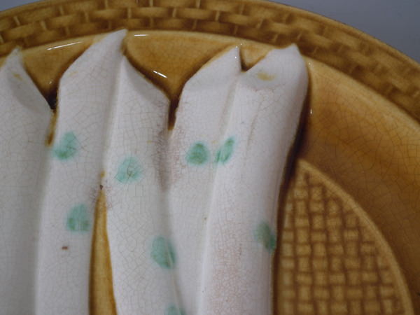 Sarreguemines Majolica asparagus plate which features overlapping asparagus tips.