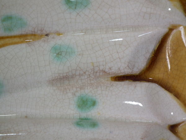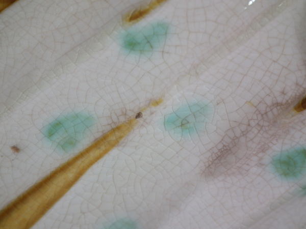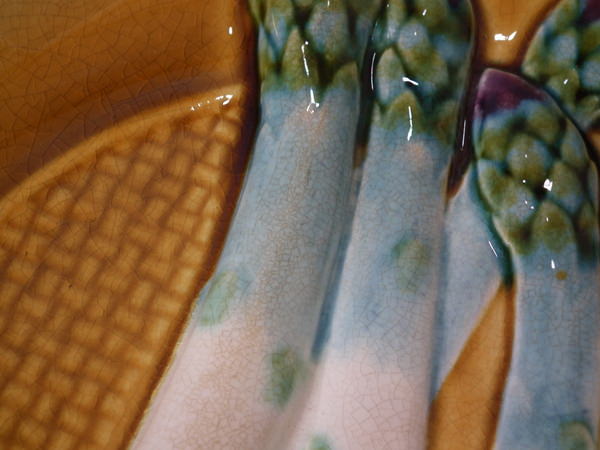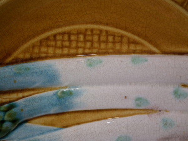 a speck of kiln grit caught in the glaze to one asparagus tip;