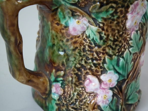 George Jones Majolica jug/pitcher which features pink and white blossom (hawthorn?).