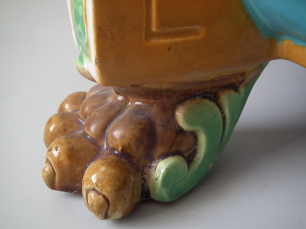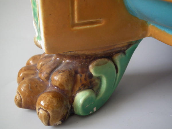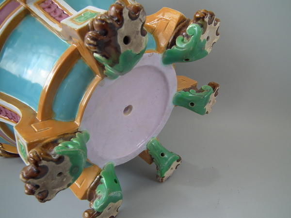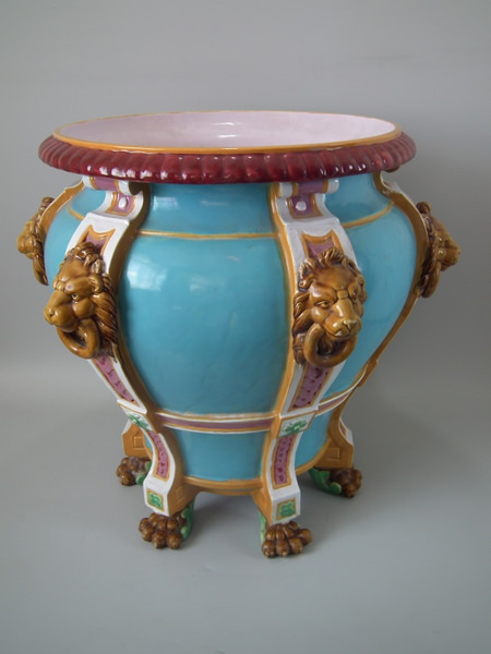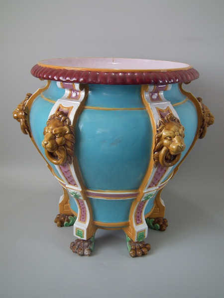 Victorian, circa 1870. 17.2ins high, 19.3ins wide, 19.3ins depth. Minton Majolica jardinière which features lion mask handles and lion paw feet.