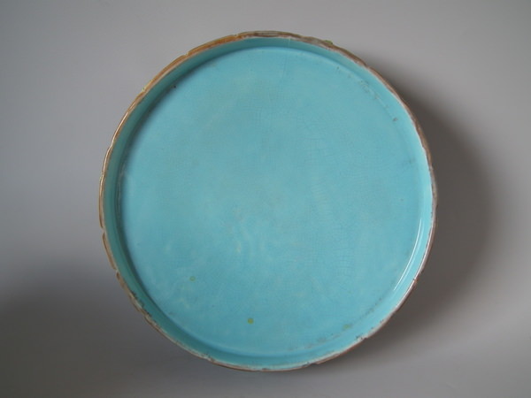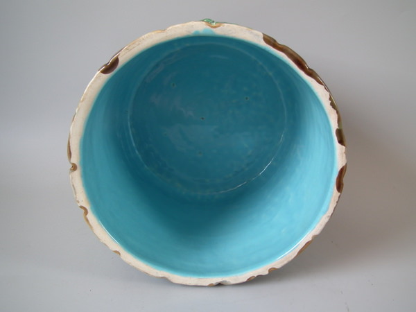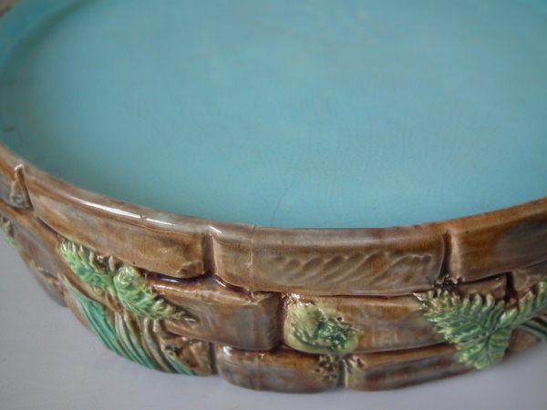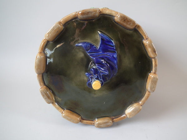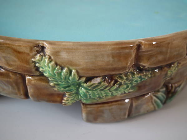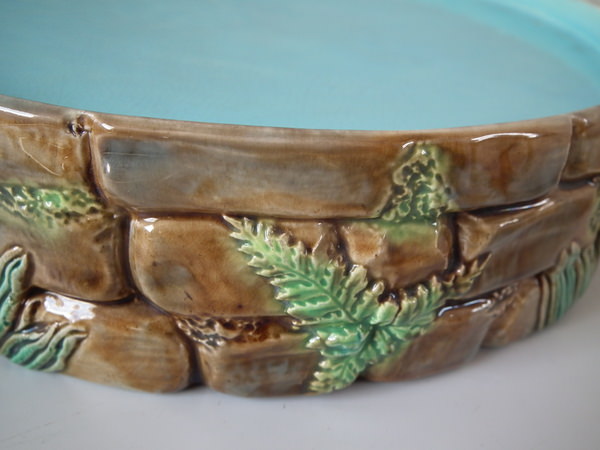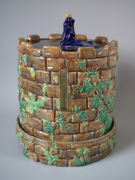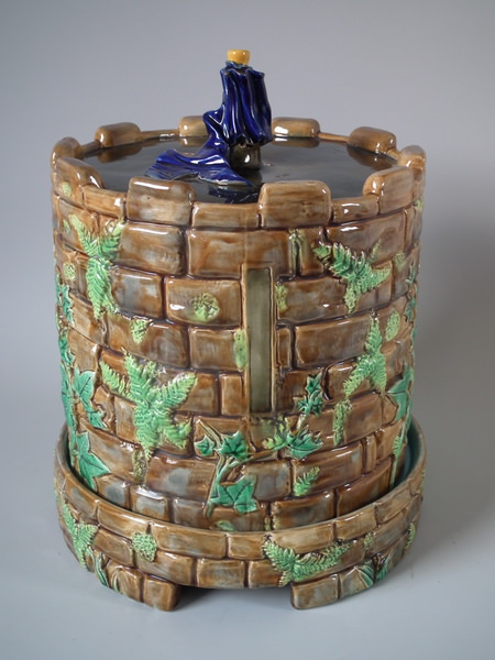 Victorian, circa 1873. 11.8ins high, 9.4ins wide, 9.4ins depth. George Jones Majolica cheese keep which features a castle tower
