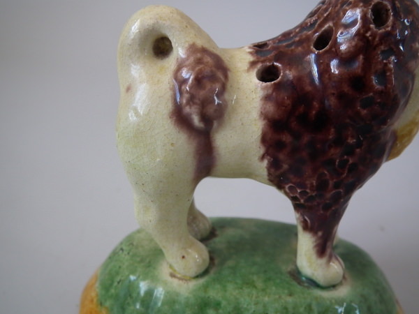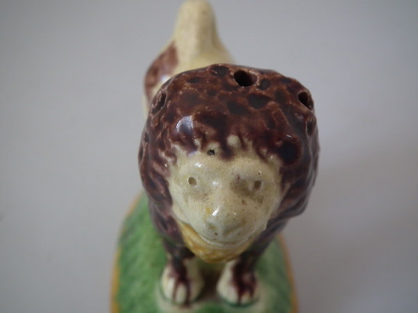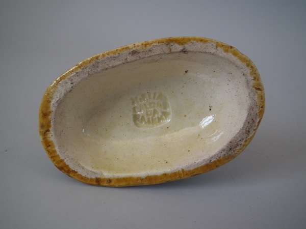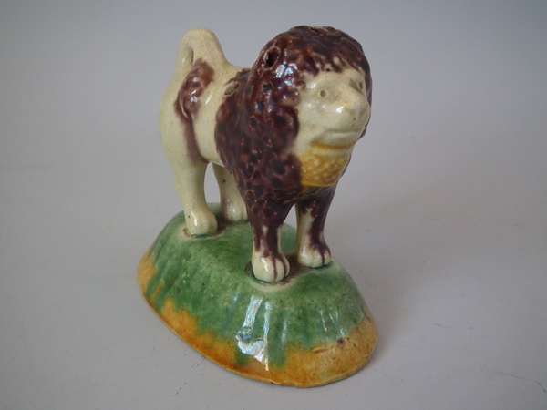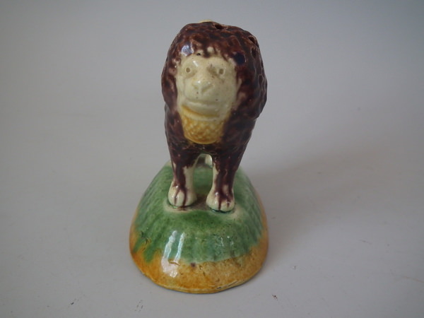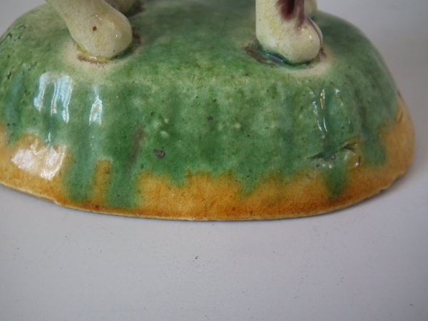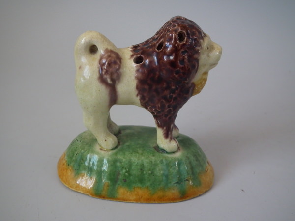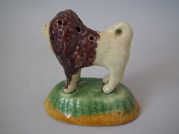 Circa 1890. 3.1ins high, 3.3ins wide, 2.1ins depth. Elias Portuguese Palissy Majolica toothpick holder which features a lion holding a basket in its mouth.