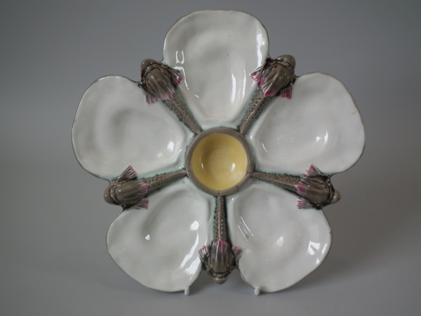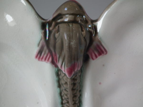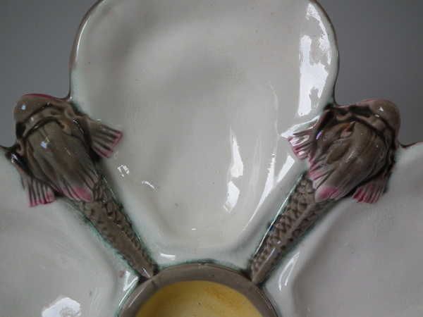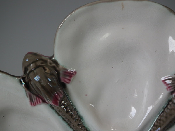 Wedgwood Argenta Majolica oyster plate which features five dolphins resting between five shells.