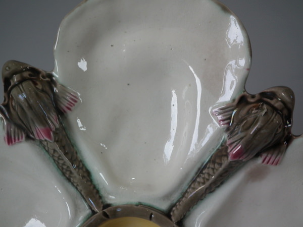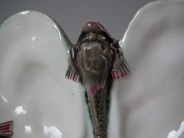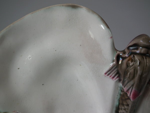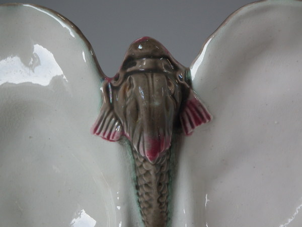 Wedgwood Argenta Majolica oyster plate which features five dolphins resting between five shells.