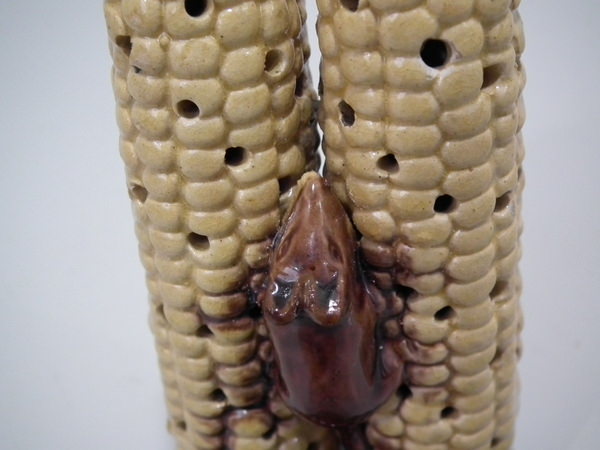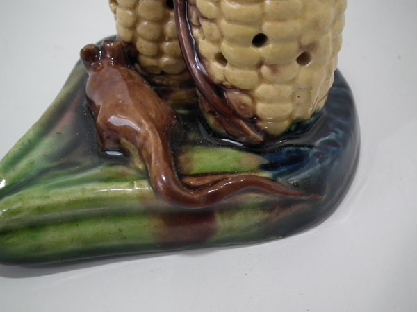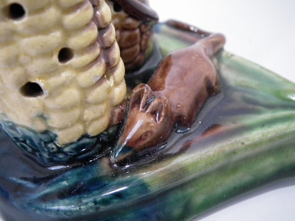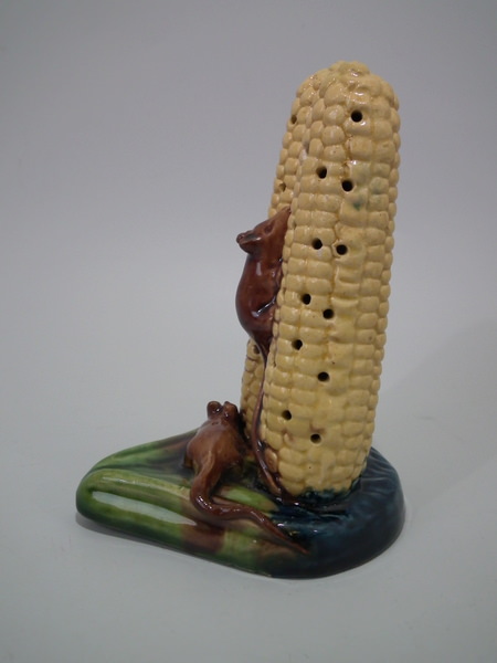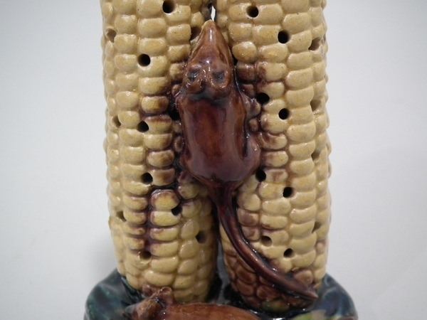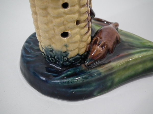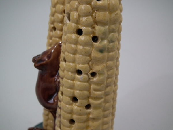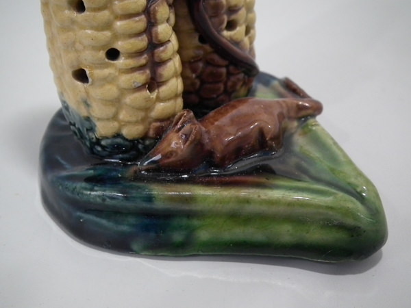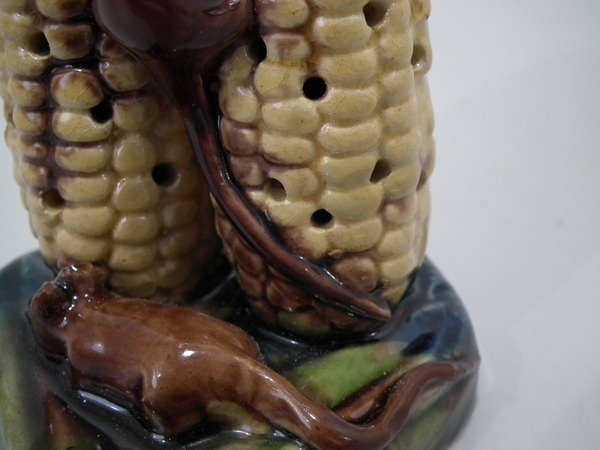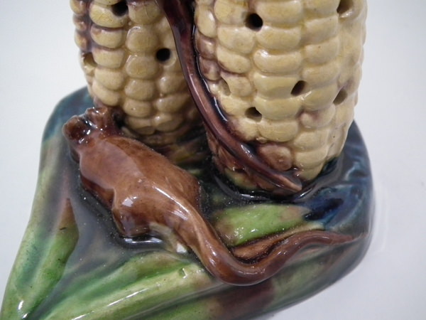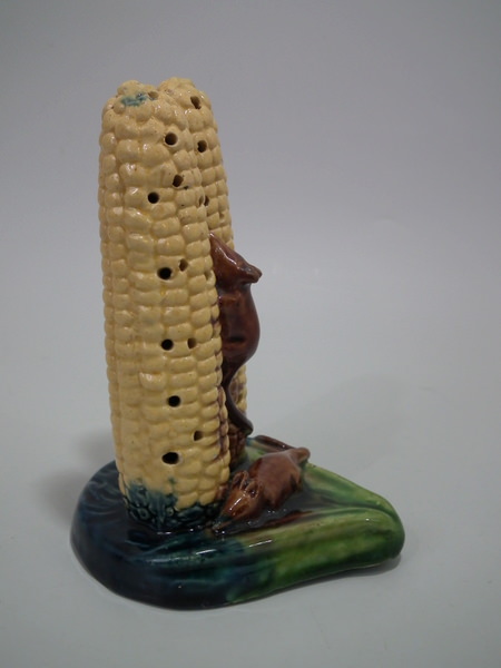 Victorian, circa 1890. 5.4ins high, 3.2ins wide, 4ins depth. Palissy Majolica toothpick holder which features mice with two cobs of corn.