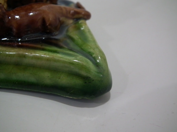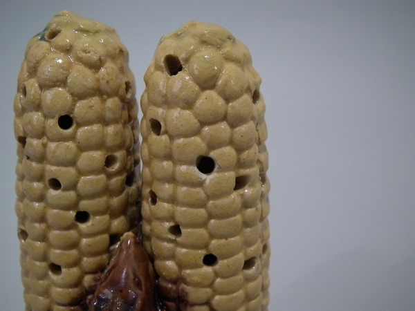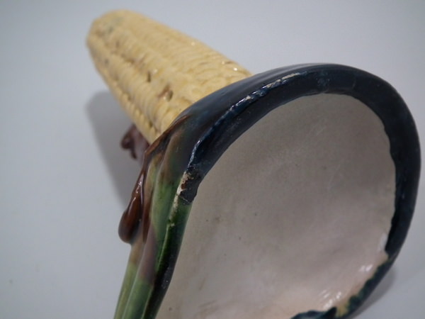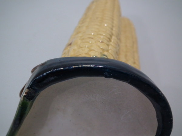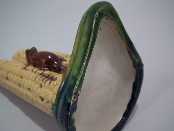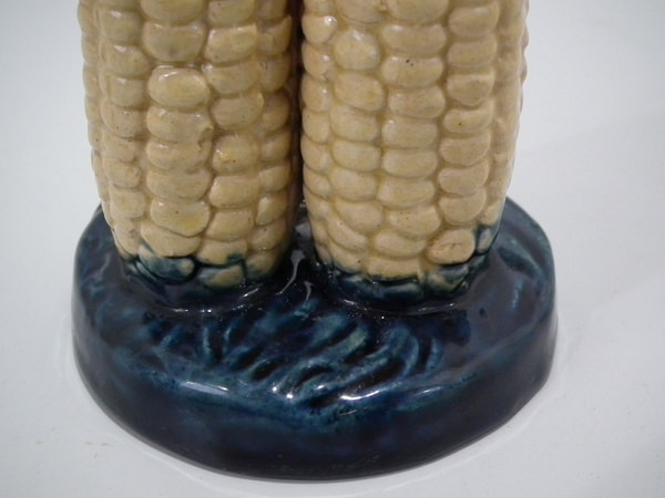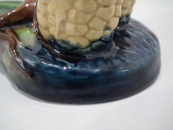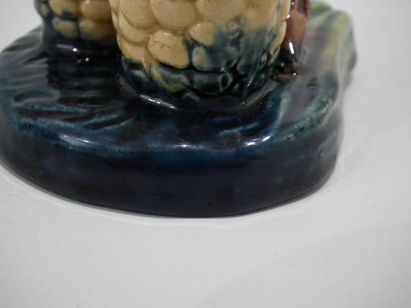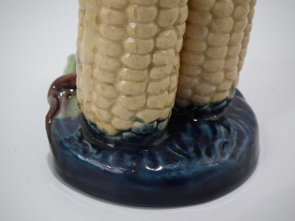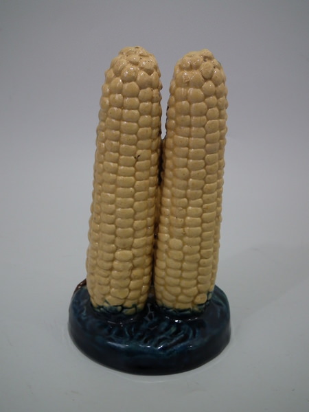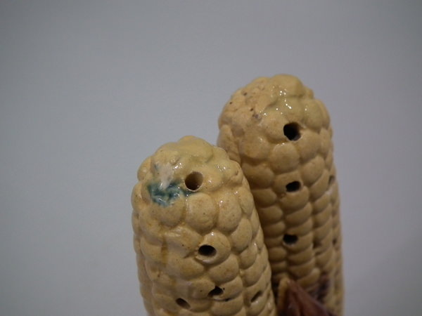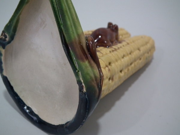 Victorian, circa 1890. 5.4ins high, 3.2ins wide, 4ins depth. Palissy Majolica toothpick holder which features mice with two cobs of corn.