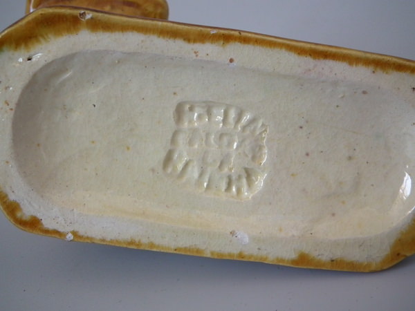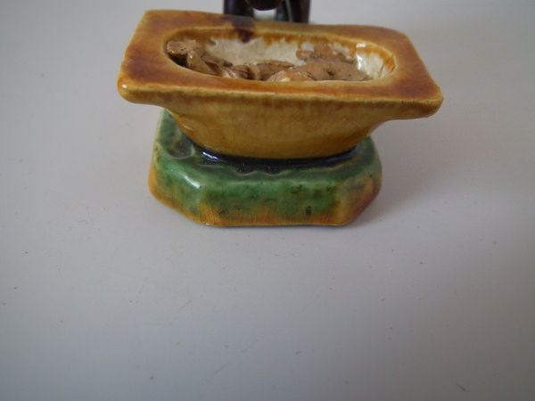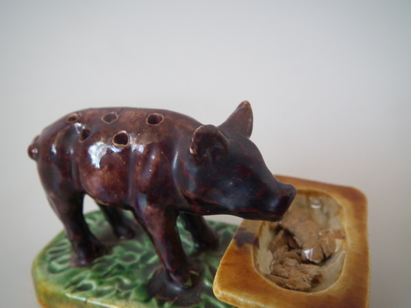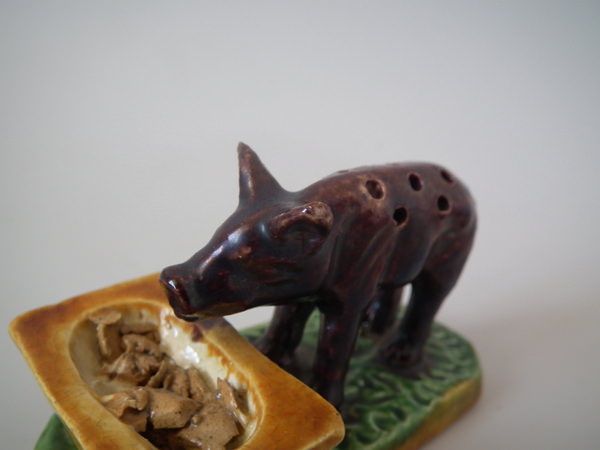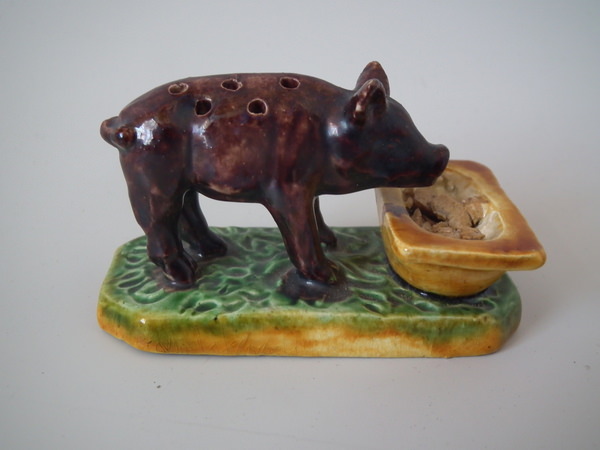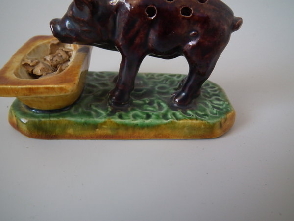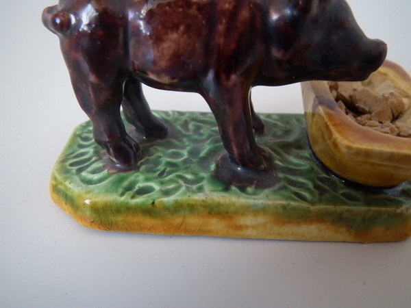 Circa 1890. 1.6ins high, 2.8ins wide, 1.3ins depth. Elias Portuguese Palissy Majolica toothpick holder which features a pig eating from a trough.
