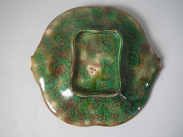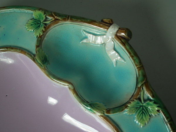 Victorian, circa 1873. 9.4ins high, 8.7ins wide, 1.5ins depth. George Jones Majolica serving dish