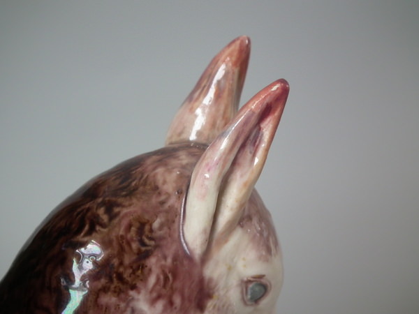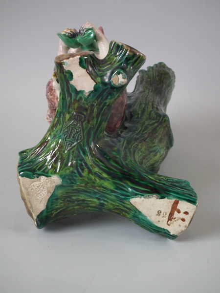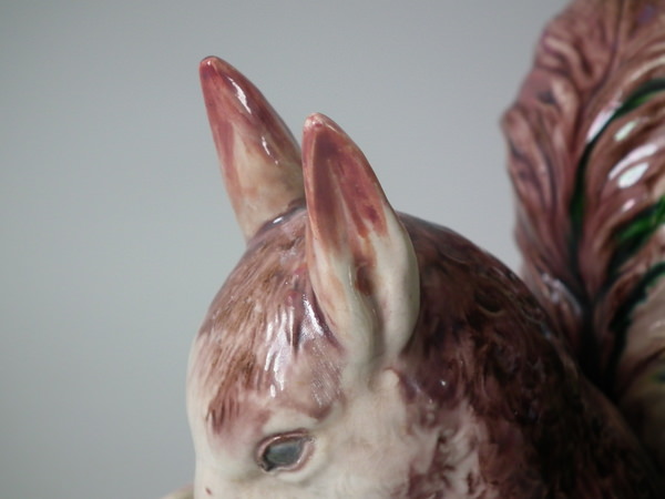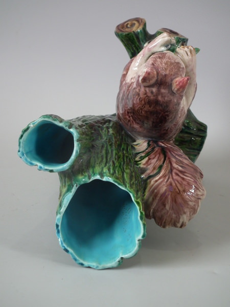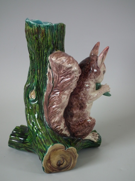 Royal Worcester Majolica vase which features a squirrel sitting at the base of a tree trunk, nibbling a chestnut.