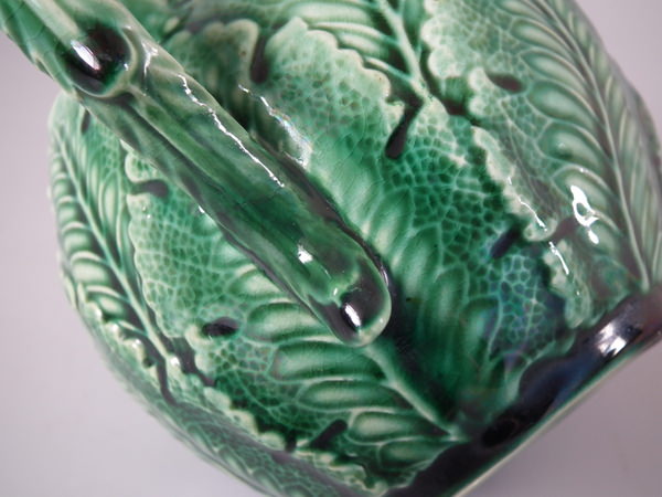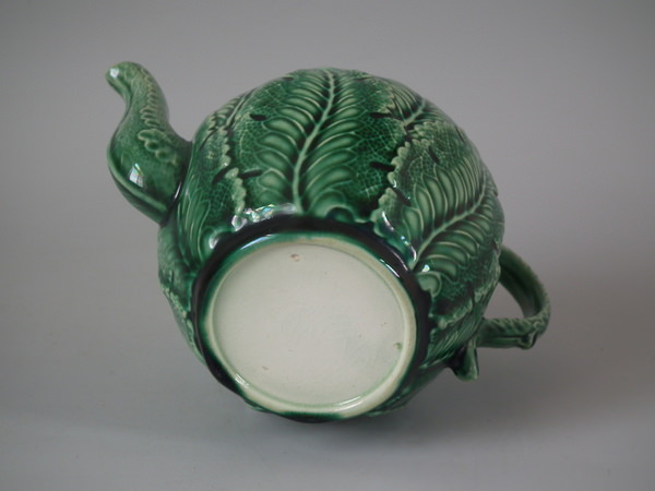 Victorian, circa 1880. 5.1ins high, 6.1ins wide, 3.9ins depth. Majolica teapot which features cauliflower leaves