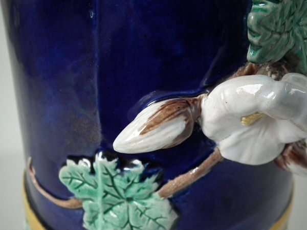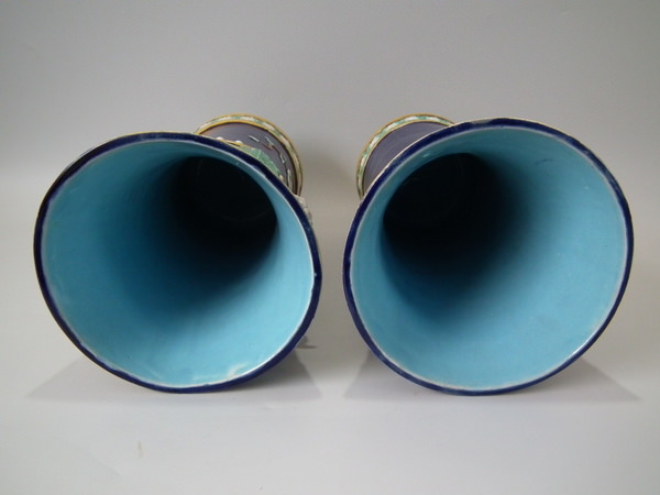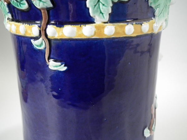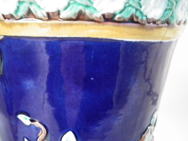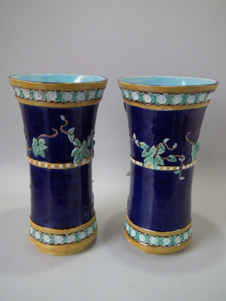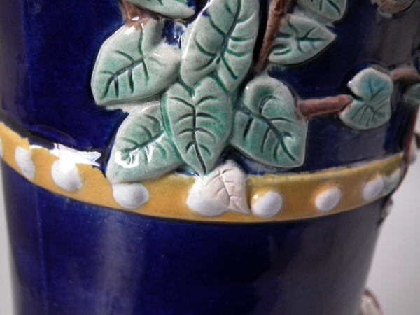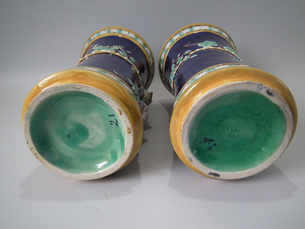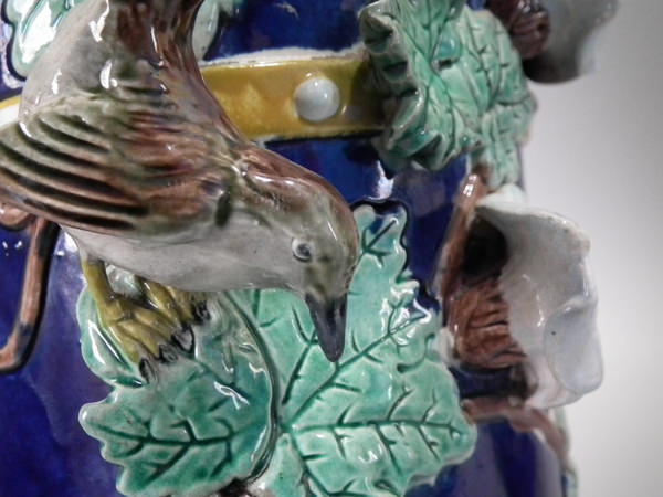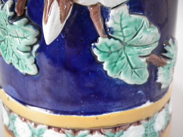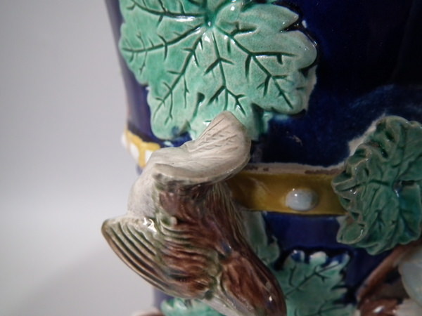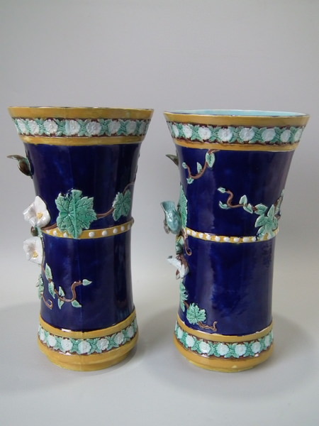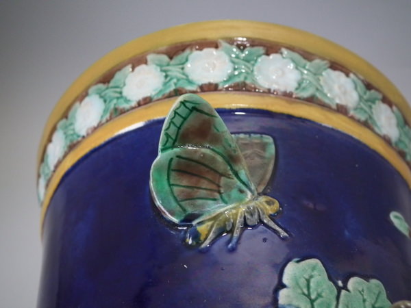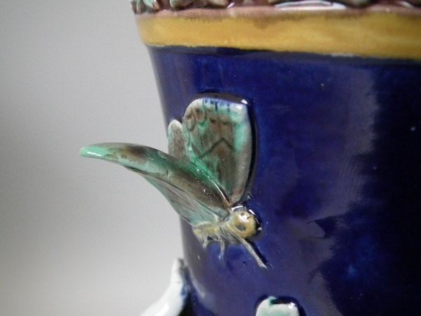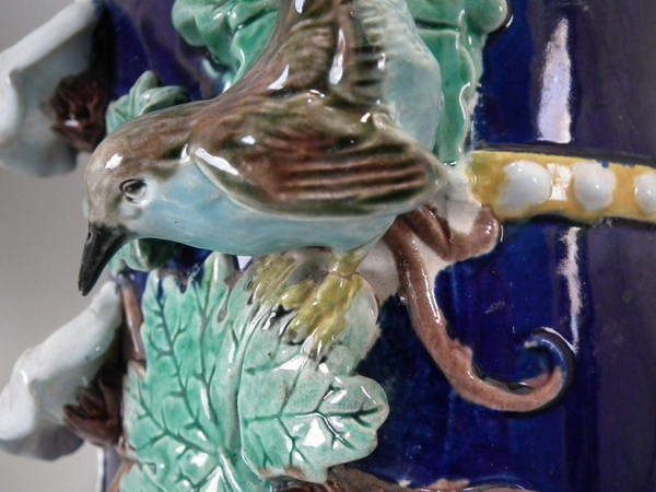 Victorian, circa 1870. Tallest is 12.8ins high, 7ins wide, 7ins depth. Pair of Holdcroft Majolica vases which feature a small bird (a wren), butterfly, white flowers and green leaves.