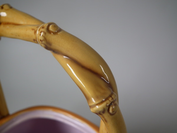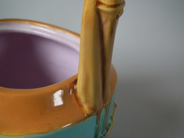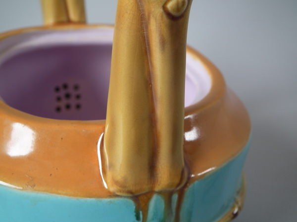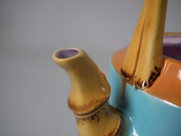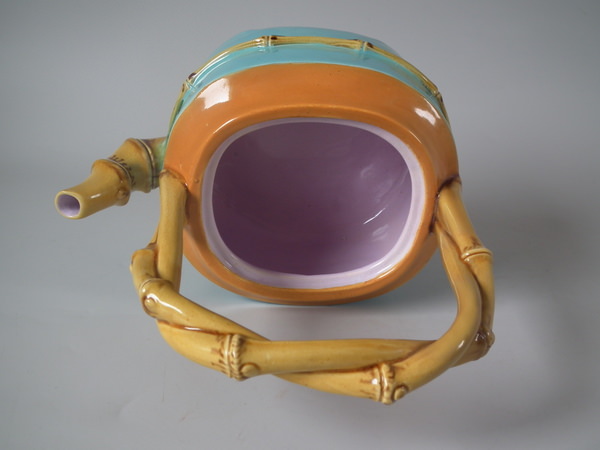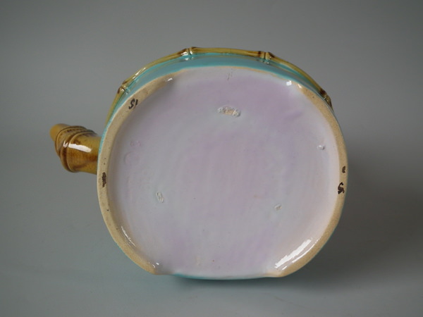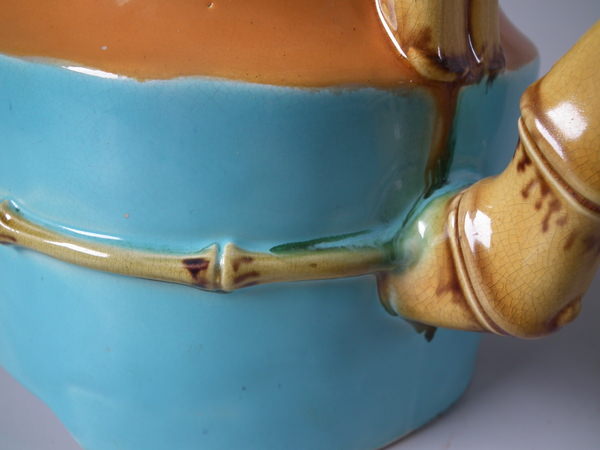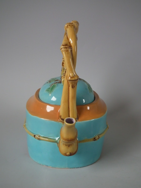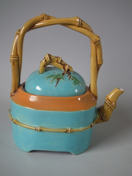 Victorian, circa 1877. 7.9ins high, 7.1ins wide, 4.9ins depth. Minton Majolica teapot which features bamboo