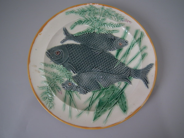 Victorian, circa 1879. 8.7ins high, 8.7ins wide, 0.8ins depth. Wedgwood Majolica plate which features fish on fern fronds and reeds. Cream ground version. Colouration: cream, green, grey, are predominant.