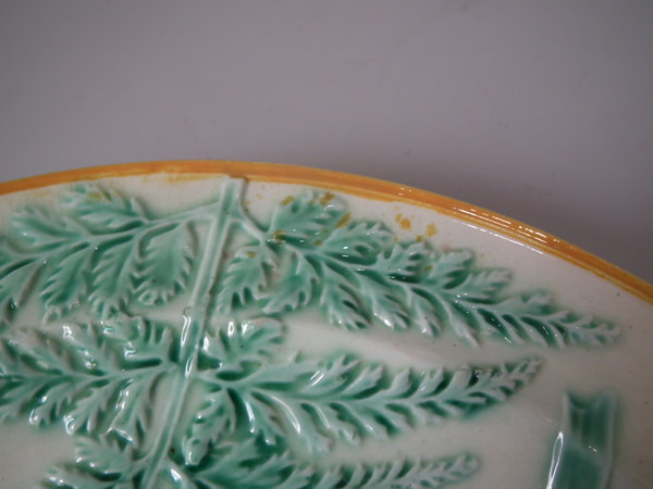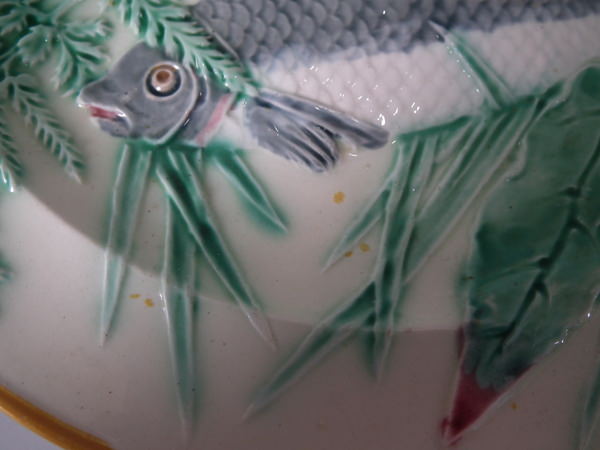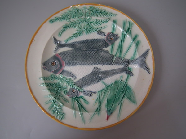 Victorian, circa 1879. 8.5ins high, 8.5ins wide, 0.8ins depth. Wedgwood Majolica plate which features fish on fern fronds and reeds. Cream ground version. Colouration: cream, green, grey, are predominant.