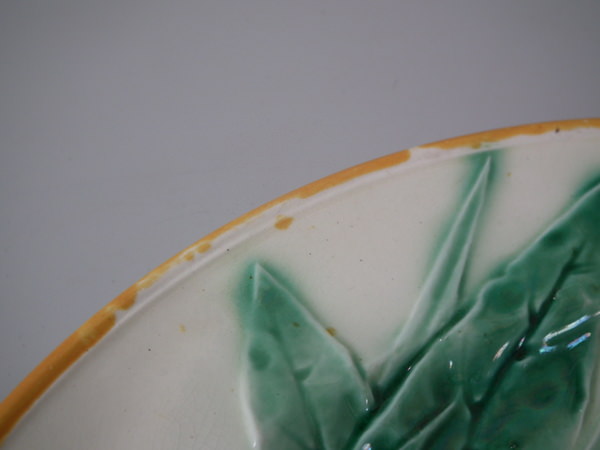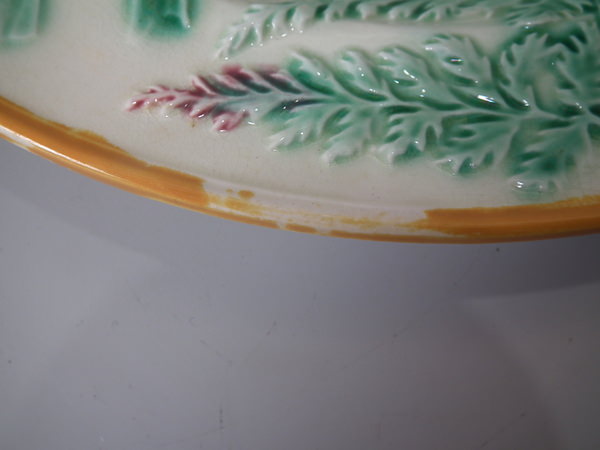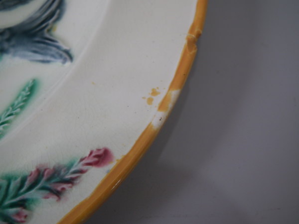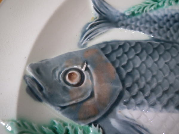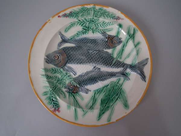 Victorian, circa 1879. 8.7ins high, 8.7ins wide, 0.8ins depth. Wedgwood Majolica plate which features fish on fern fronds and reeds. Cream ground version. Colouration: cream, green, grey, are predominant.