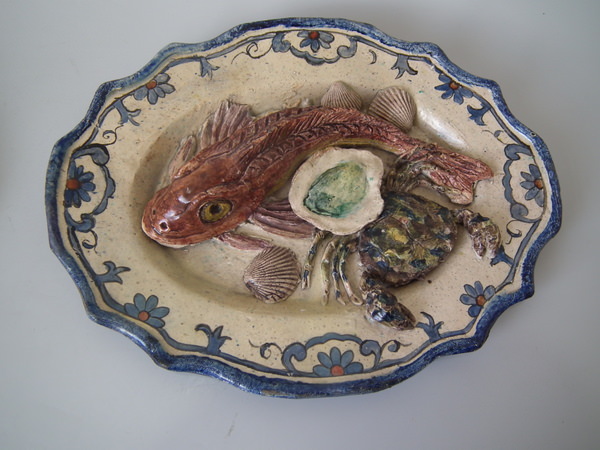 Victorian, circa 1890. Tallest is 10.2ins high, 13.4ins wide, 1.8ins depth. Pair of Landais French Palissy Majolica wall plates which feature fish, an eel, crab and shells.