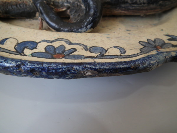 Some flakes to the rim, to two fishes scales, and one to the floral rim border.