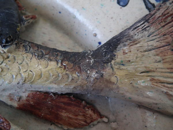 Large fish's tail has filled crack.