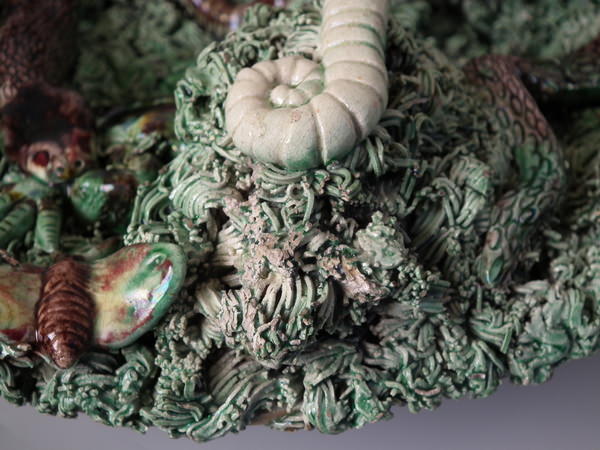 Victorian, circa 1890. 9.4ins high, 9.4ins wide, 3ins depth. Cunha Portuguese Palissy Majolica wall plate which features a snake, lizards, moths and grubs.