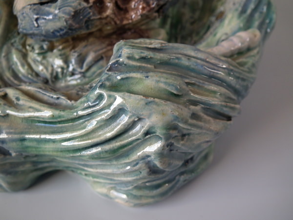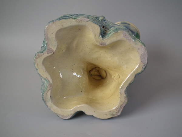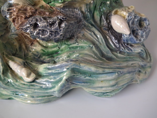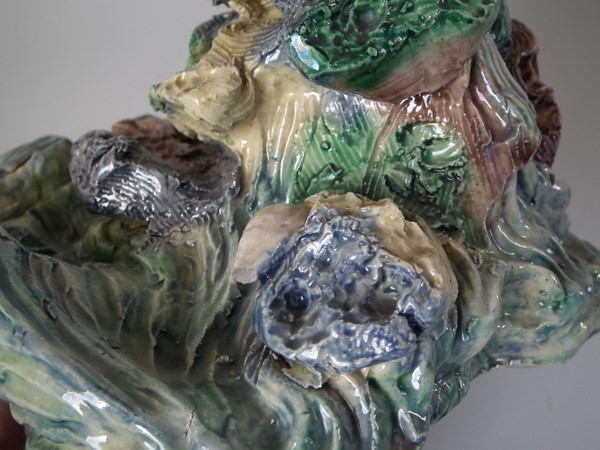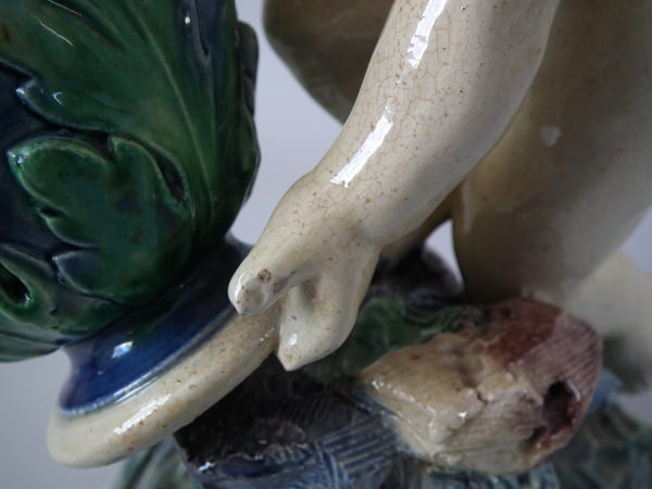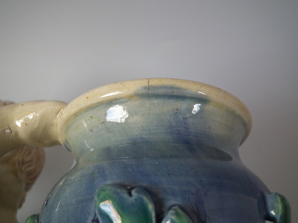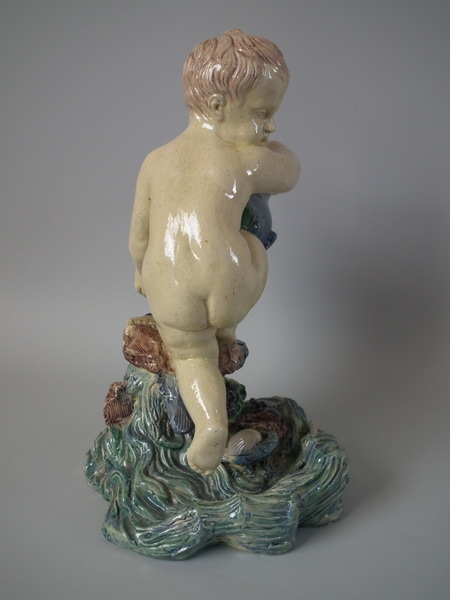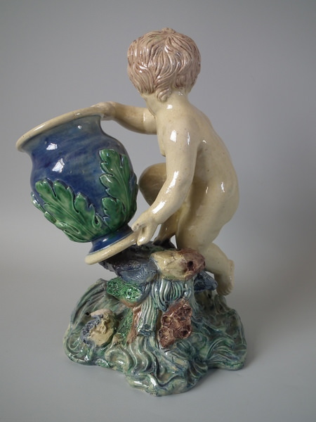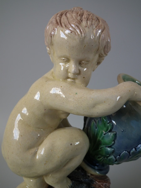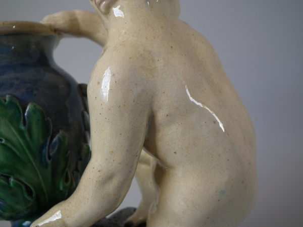 Victorian, circa 1890. 12.4ins high, 8.7ins wide, 7.1ins depth. French Palissy Majolica vase which features a putti on a rocky outcrop with shells attached, holding on to a vase.