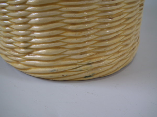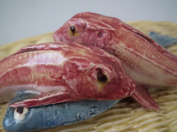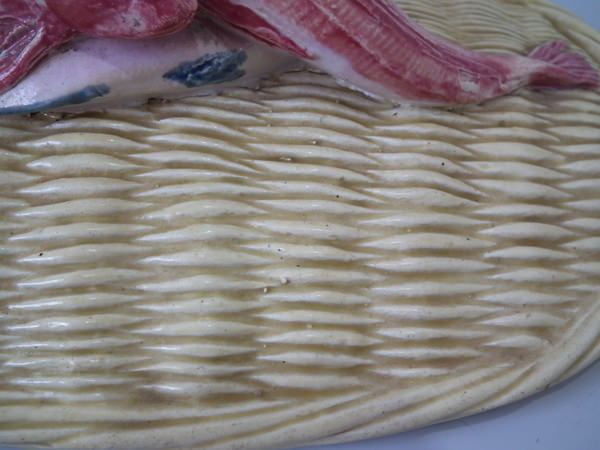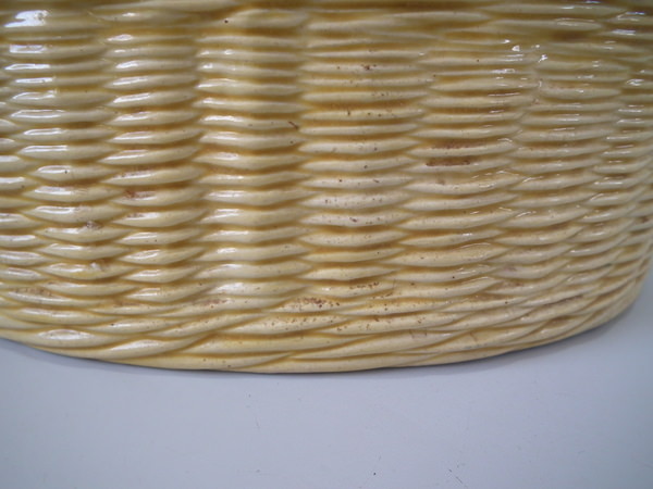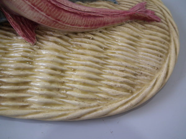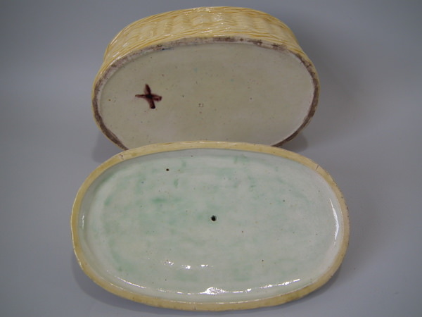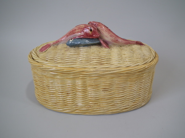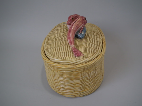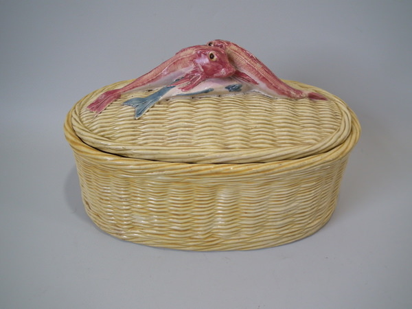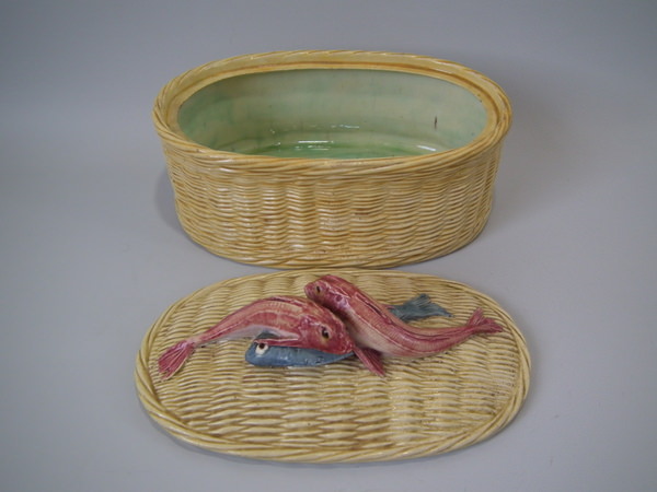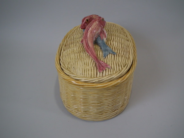 Victorian, circa 1880. 5.9ins high, 10.2ins wide, 6.7ins depth. Thomas Sergent Majolica tureen with cover which features a basket weave ground and three fish forming the handle.