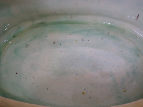 KILN EFFECTS: kiln detritus caught in the glaze to the ground.
