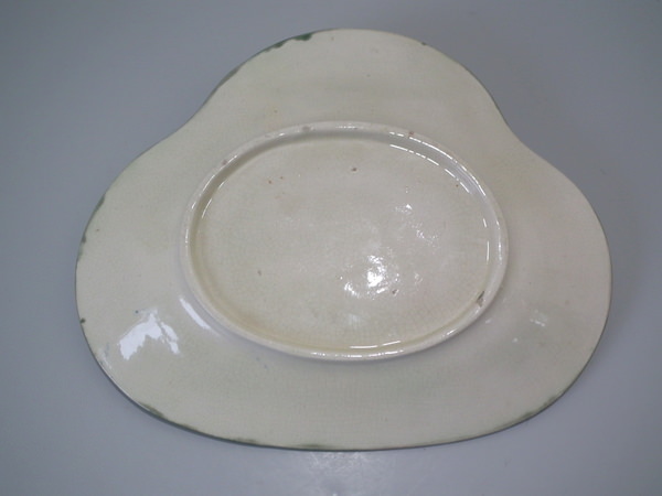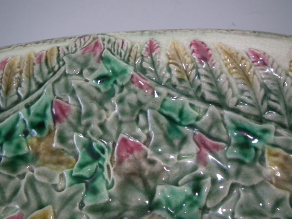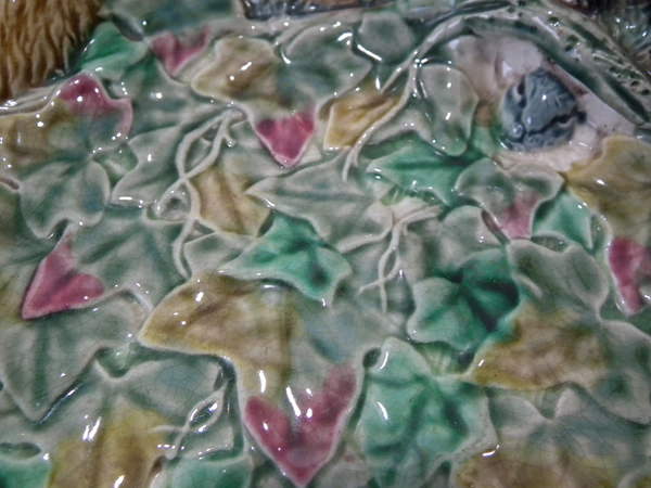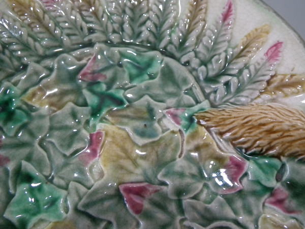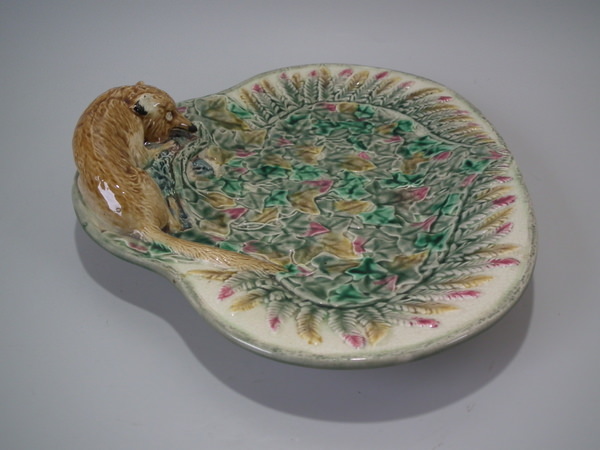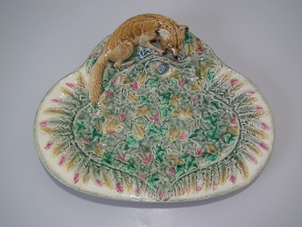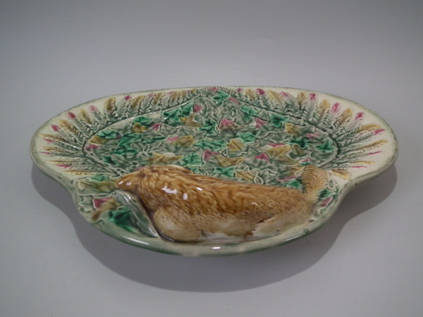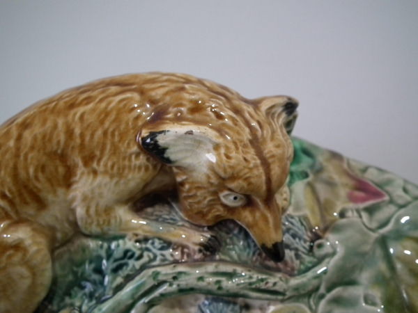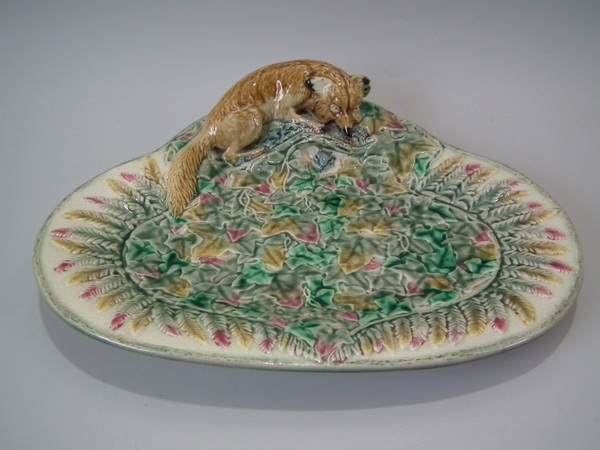 Victorian, circa 1880. 2.6ins high, 12.1ins wide, 9.8ins depth. Majolica dish which features a fox stalking a rabbit. Cream ground version.