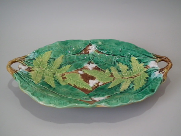 Victorian, circa 1870. 7.9ins high, 11.4ins wide, 1.2ins depth. Majolica which features fern leaves, flowers and twig like handles.
