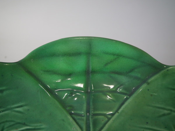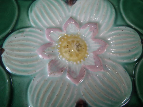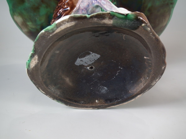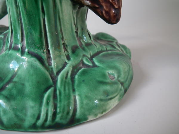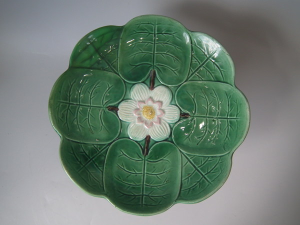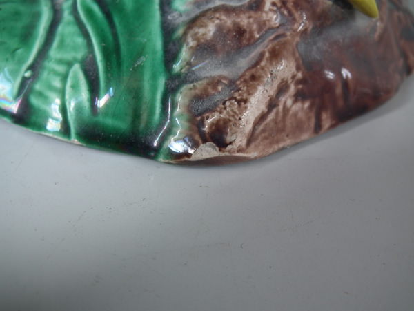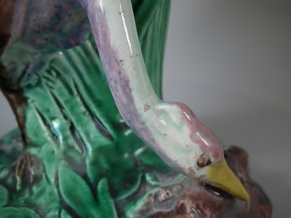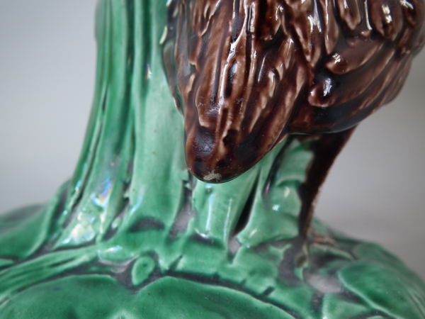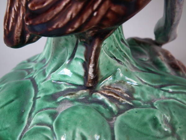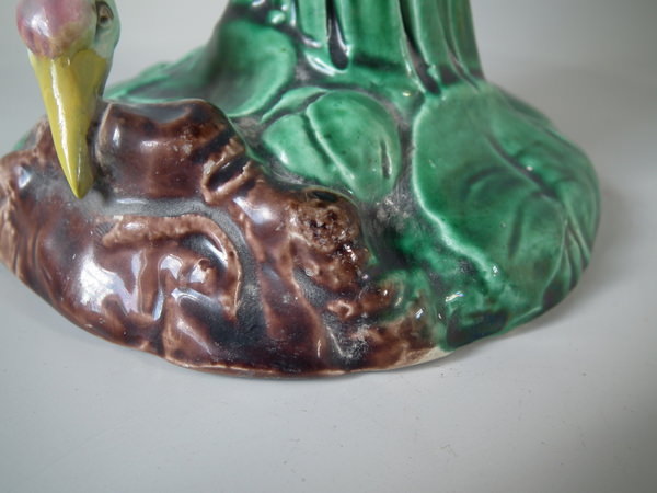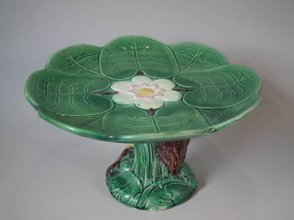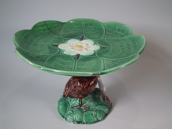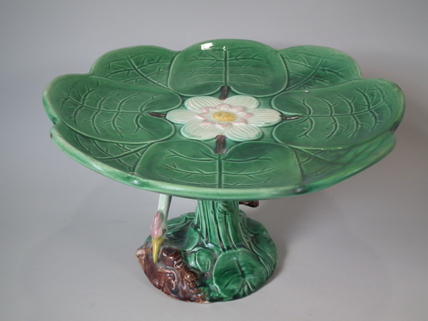 Victorian, circa 1880. 6.3ins high, 10ins wide, 10ins depth. Majolica compote which features lily leaves and a flower, with a heron stood in front of reeds/bulrushes to the base.