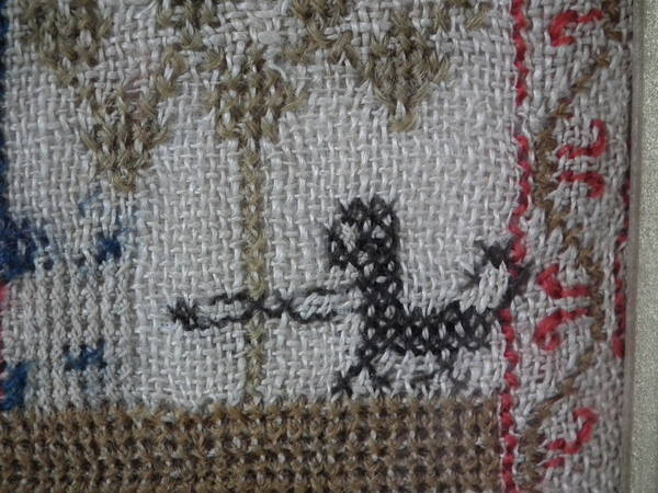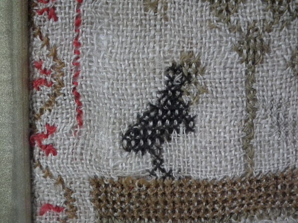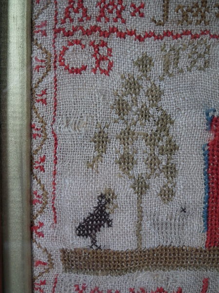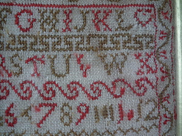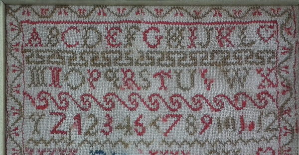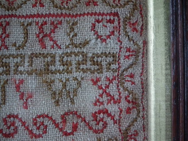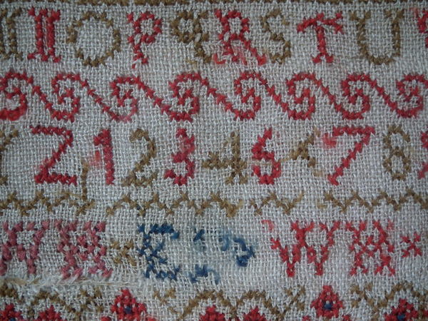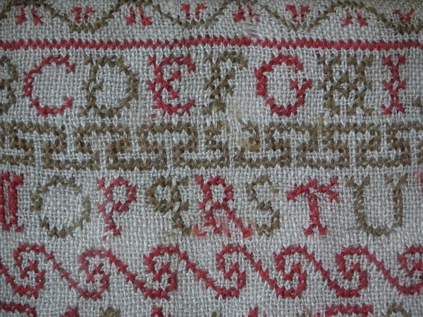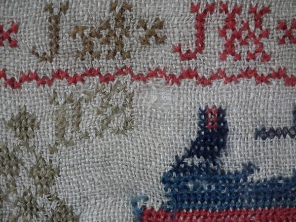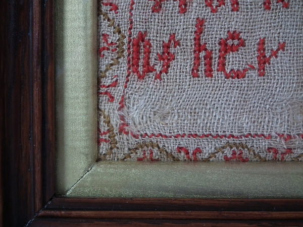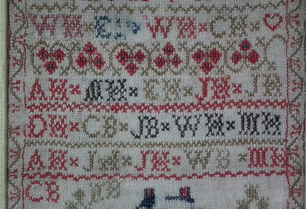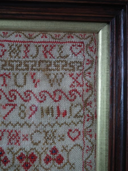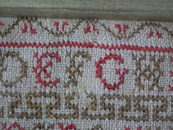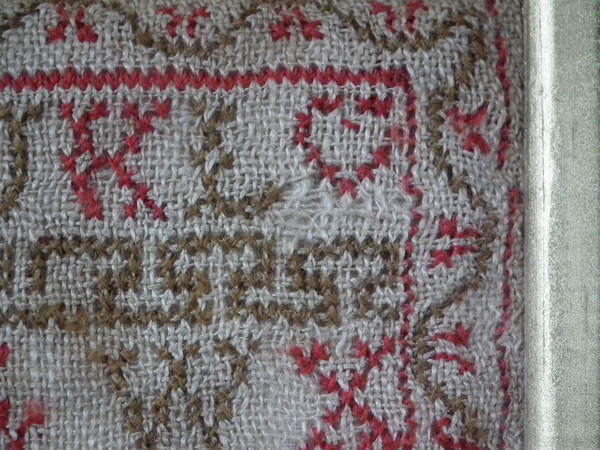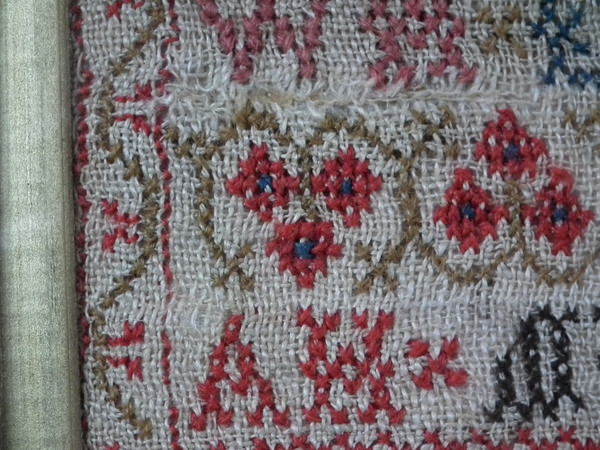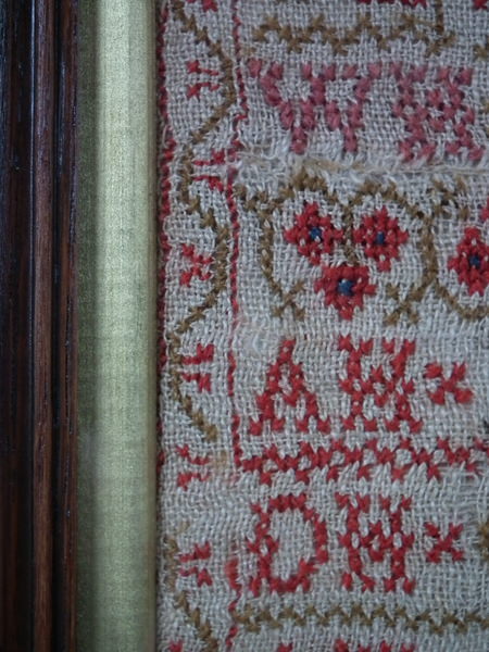 The sampler is worked in fine wool on linen ground, in cross stitch throughout.