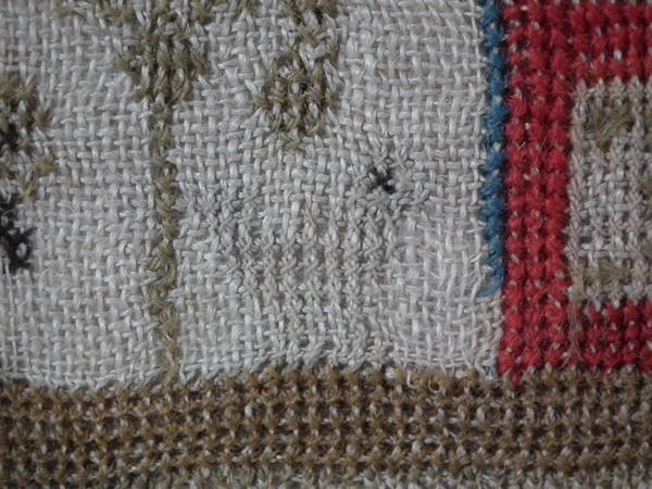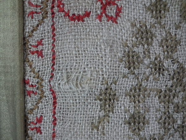 No stains. Stitch losses to the border, divider lines, the signature, motifs and letters/numbers.